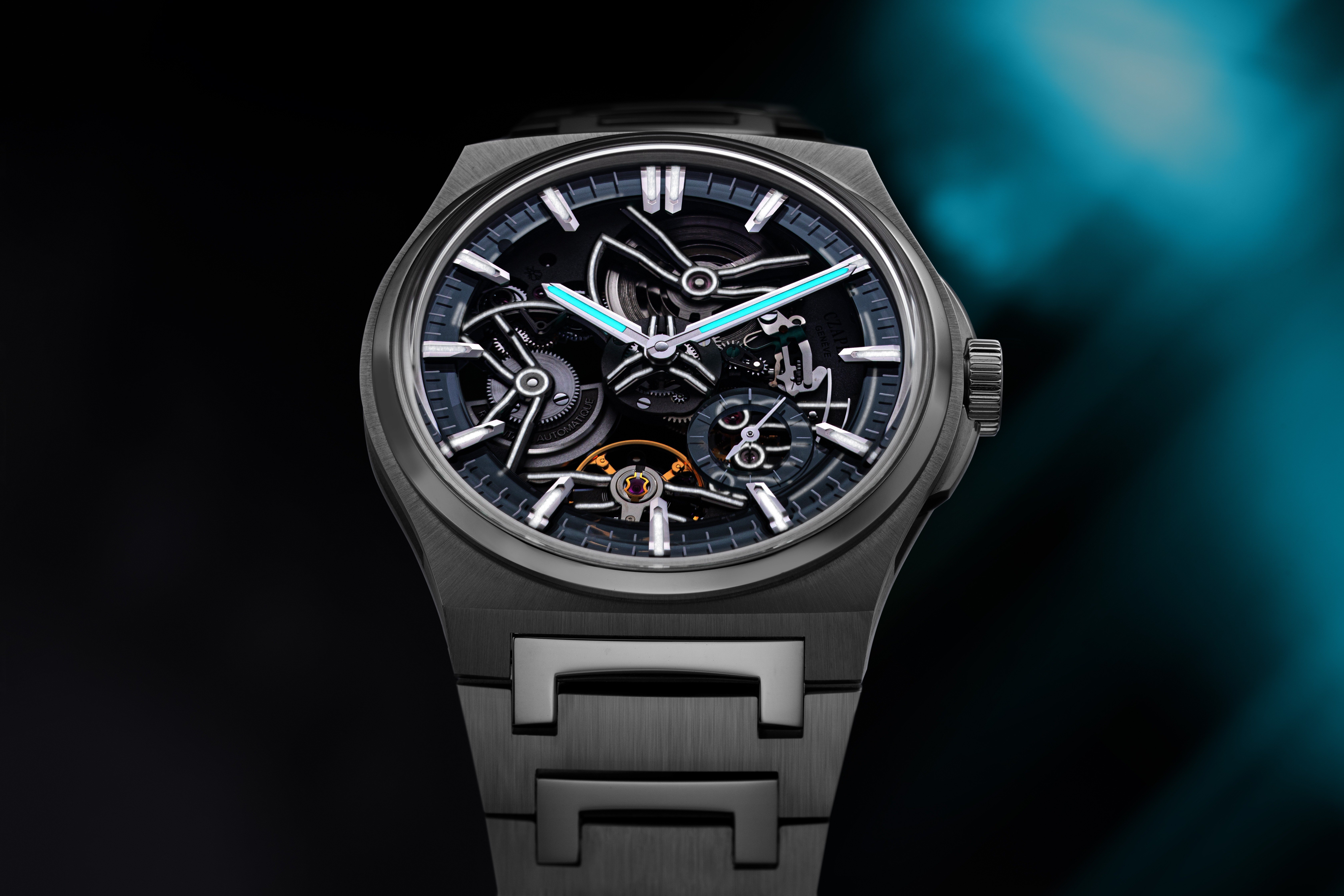 For the first time in a skeletonised integrated sports chic watch, “white” Super-LumiNova has been applied directly to the movement bridges, creating a luminous canvas like no other. Paired with striking blue-lumed hands, the result is a bold interplay of light and shadow. Nearly every visible surface — from the mainspring barrel to the subsidiary seconds — emits a radiant glow, delivering a dramatic contrast that’s both visually arresting and elegantly restrained.