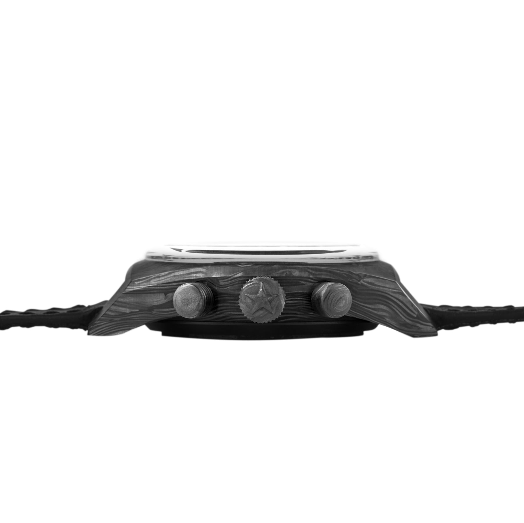 There is no performance material with a higher strength-to-weight ratio than carbon fiber. If you compare strength using the same sample size of steel, titanium and carbon, the carbon piece would be multiple times stronger. That’s the reason carbon fiber is used so ubiquitously in all performance sports today. From the hull, mast and even the sails of America’s Cup superyachts, to every Formula 1 car on the starting grid, to every bicycle racing in the Tour de France. Our watch is so strong because it’s made entirely from high-modulus forged carbon fiber, which is CNC-machined to create each individual part. That means the case, the dial, the pushers and the crown are all milled from blocks of solid carbon. Only the caseback and the movement ring are made in blacked-out grade 5 titanium to ensure water resistance.