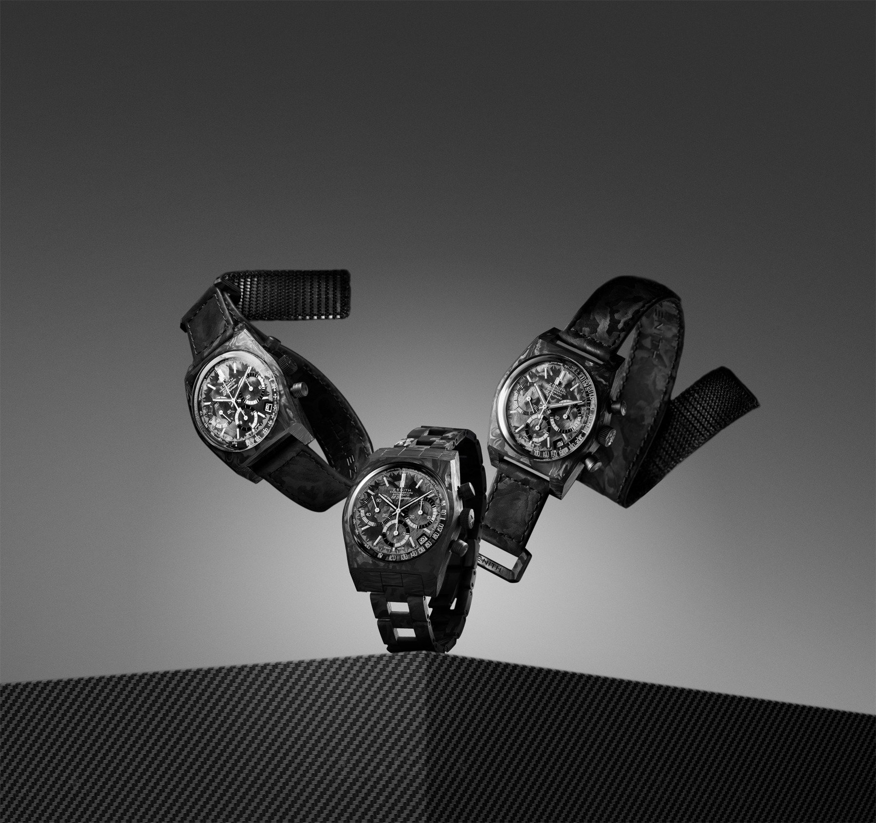 This is the lightest Zenith El Primero chronograph that has ever been produced. With its carbon Velcro strap, it weighs just 55 grams. To place this in context, our steel Cover Girl Revival from 2020 weighed 110.6 grams, and our grade 5 titanium Cover Girl Airweight from 2022 weighs 78.2 grams. Even when fixed with our carbon fiber ladder-style bracelet, the new Cover Girl Carbon weighs just 59 grams. Because of its incredible light weight, strapping the watch on genuinely feels like you are wearing nothing at all on your wrist.