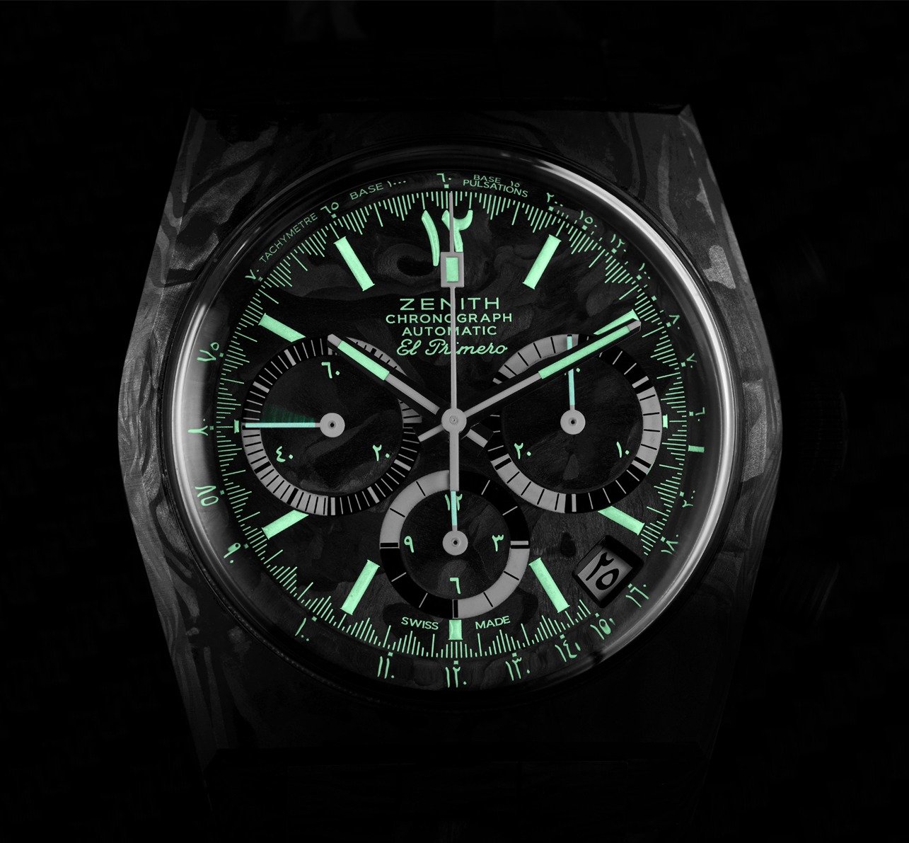 Matte black carbon fiber with “shark tooth” chronograph scale; applied Super-LumiNova on every dial marking