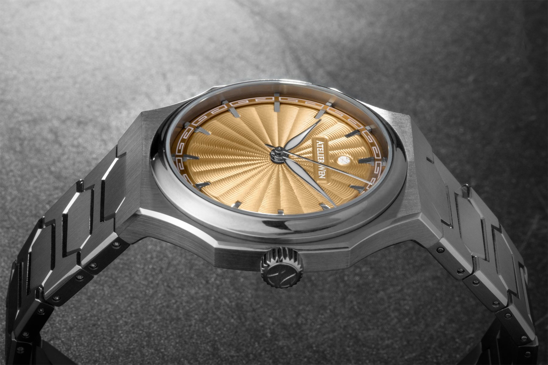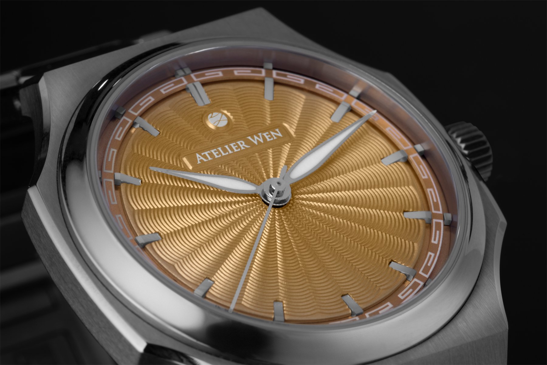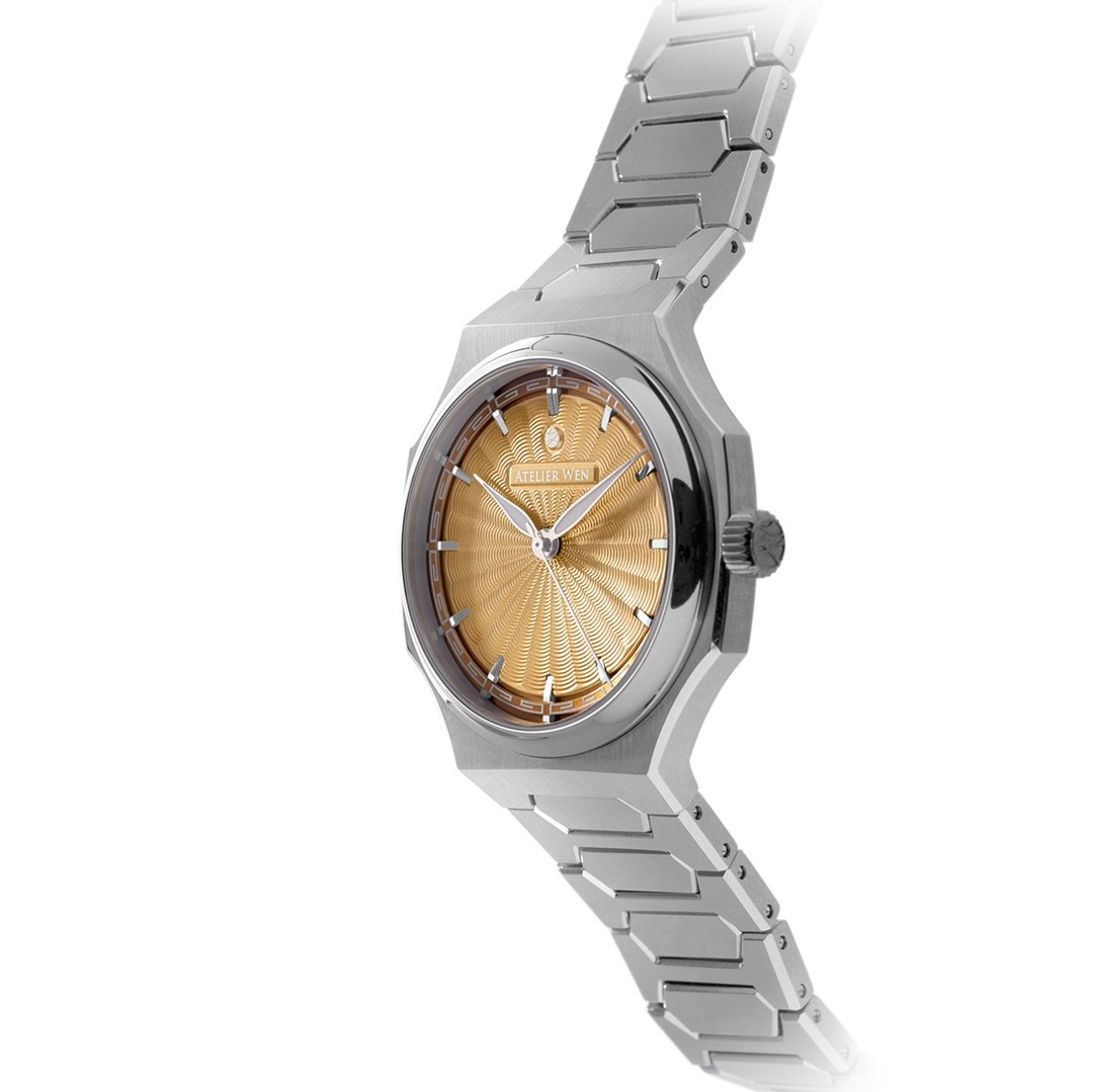 The proportions of this Atelier Wen Perception with champagne dial are practically perfect for a modern sports watch. The 40mm width is offset with a very slender 9.4mm height, achieved thanks to a slim SL1588 caliber.