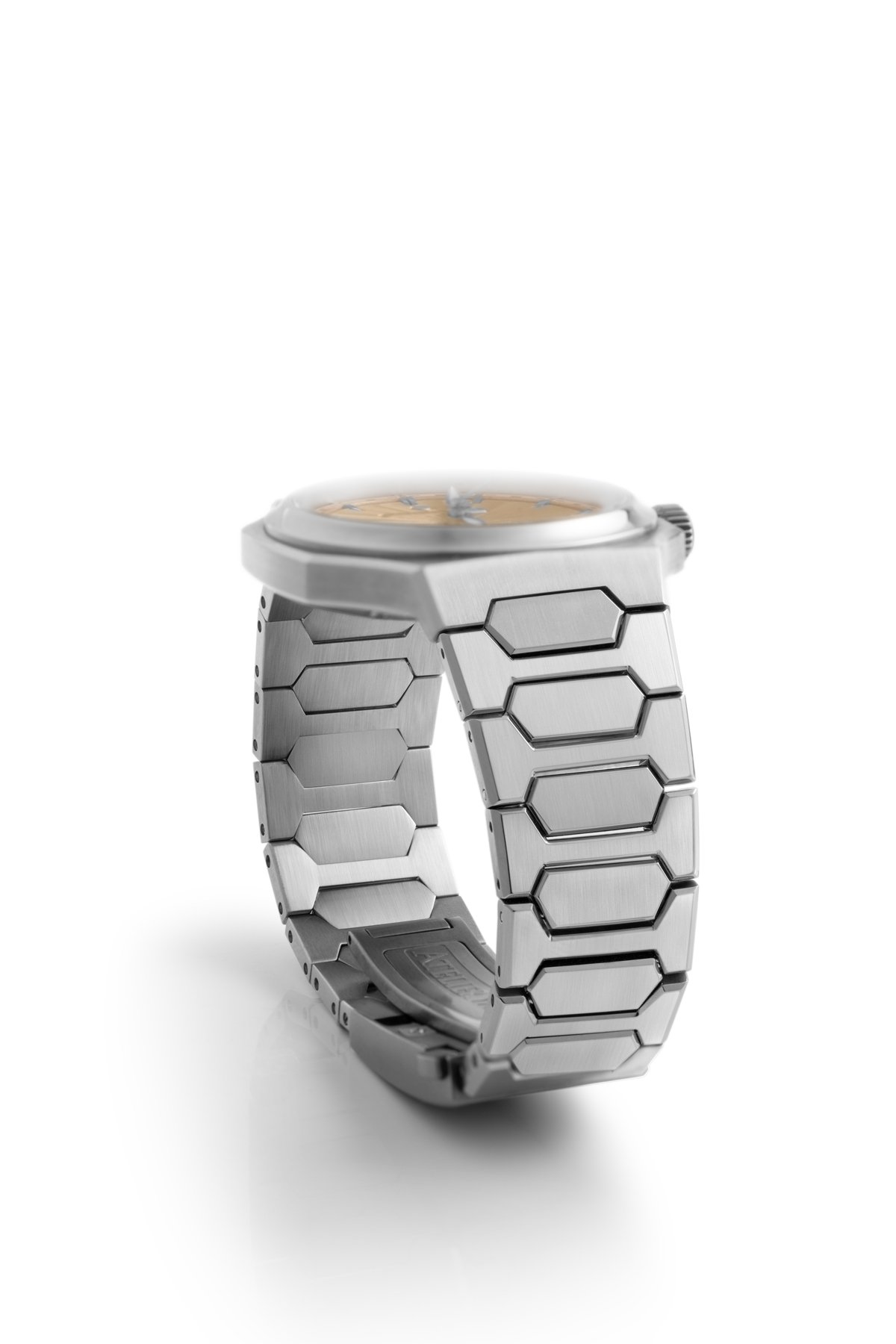 The integrated titanium bracelet looks good from every angle, thanks to the fact that the inner angles on all of the links have been polished to a high shine.