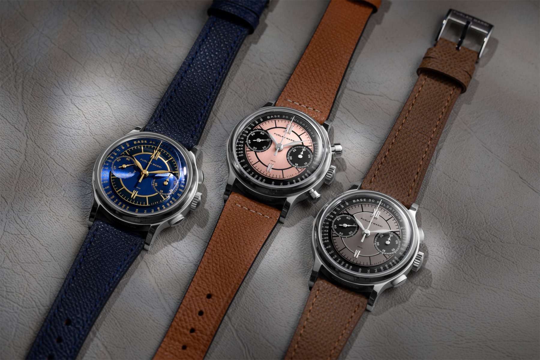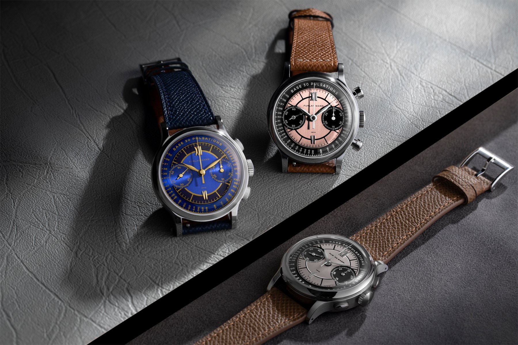 It’s hard to believe that Furlan Marri was only founded in 2021. With their eye for design and clear vintage aesthetic, it’s easy to see why the brand has been a runaway success. For this next chapter in the brand’s story, Furlan Marri has partnered with the legendary Auro Montanari and Revolution for an unforgettable trilogy of watches. This collector box set offers one of each version: the 3177-A’ 'Taupe Flyback', the 3188-A ‘Salmon Flyback’ and the 3199-A ‘Honey Blue Flyback’. The words’ crafted with care, designed for details’ can be found on the column wheel, and this set epitomises these values to the fullest.