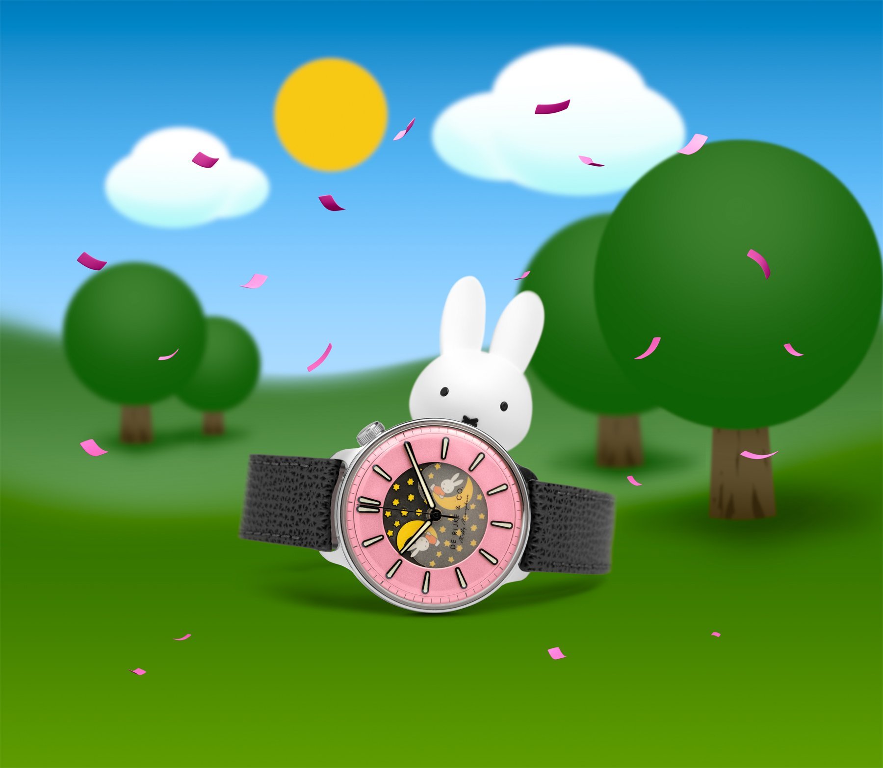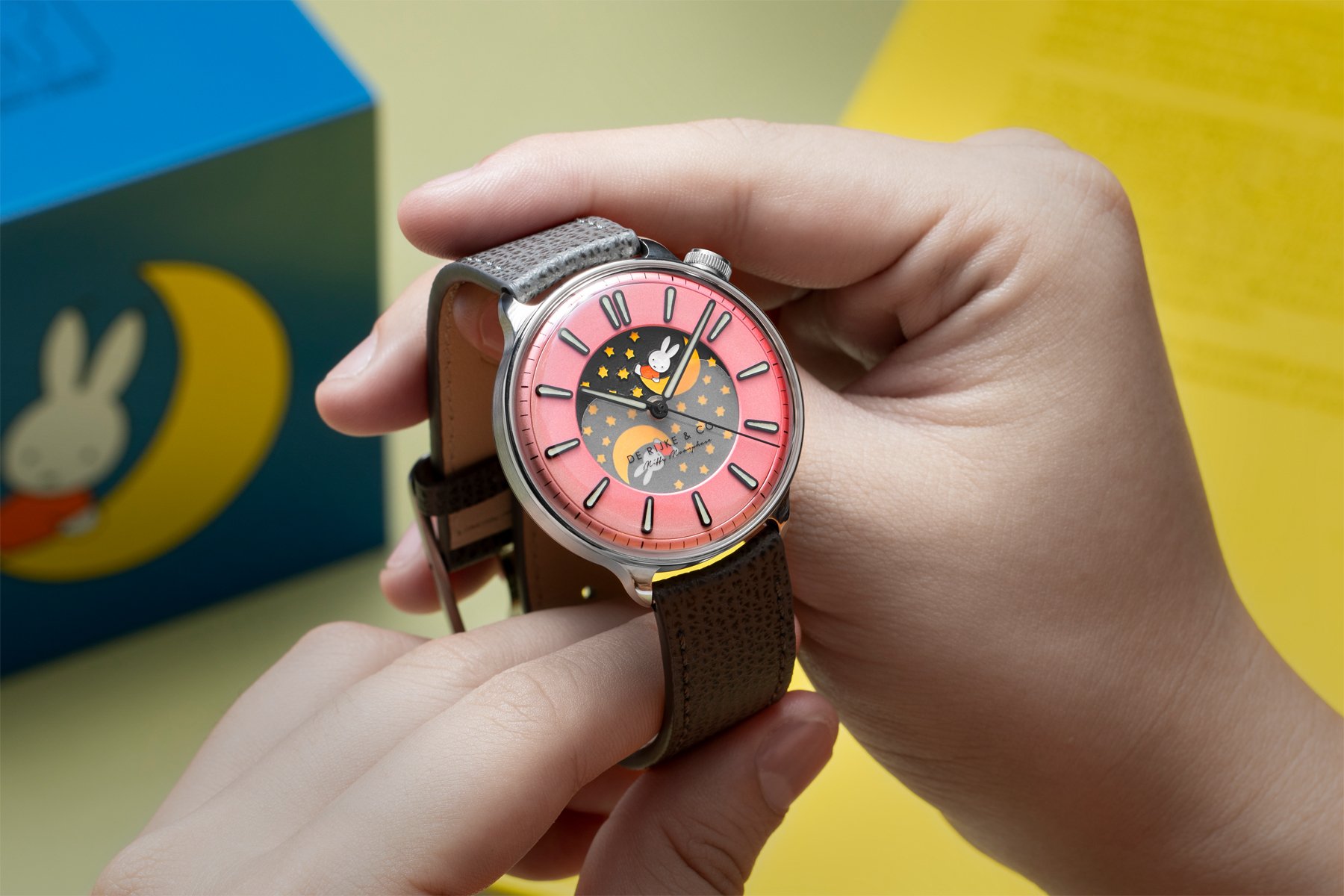 Dick Bruna’s famous rabbit has pride of place at the center of the dial, with duplicate rabbits sitting astride one of the largest moonphase indicators in watchmaking, making a big impact for such a small rabbit.