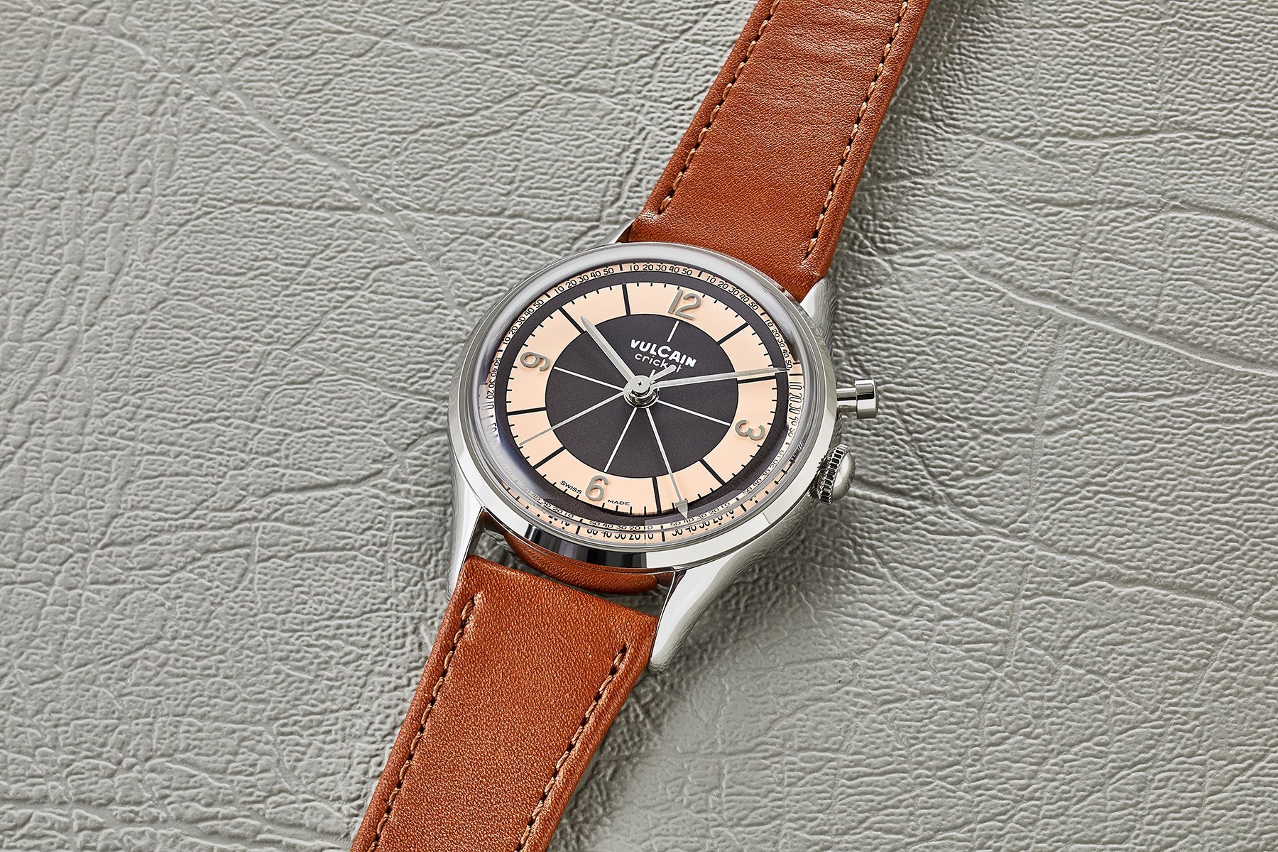 While vintage Vulcain Crickets came in more diminutive sizes, this 39mm polished steel case, water-resistant to 50M is perfect for the present day.