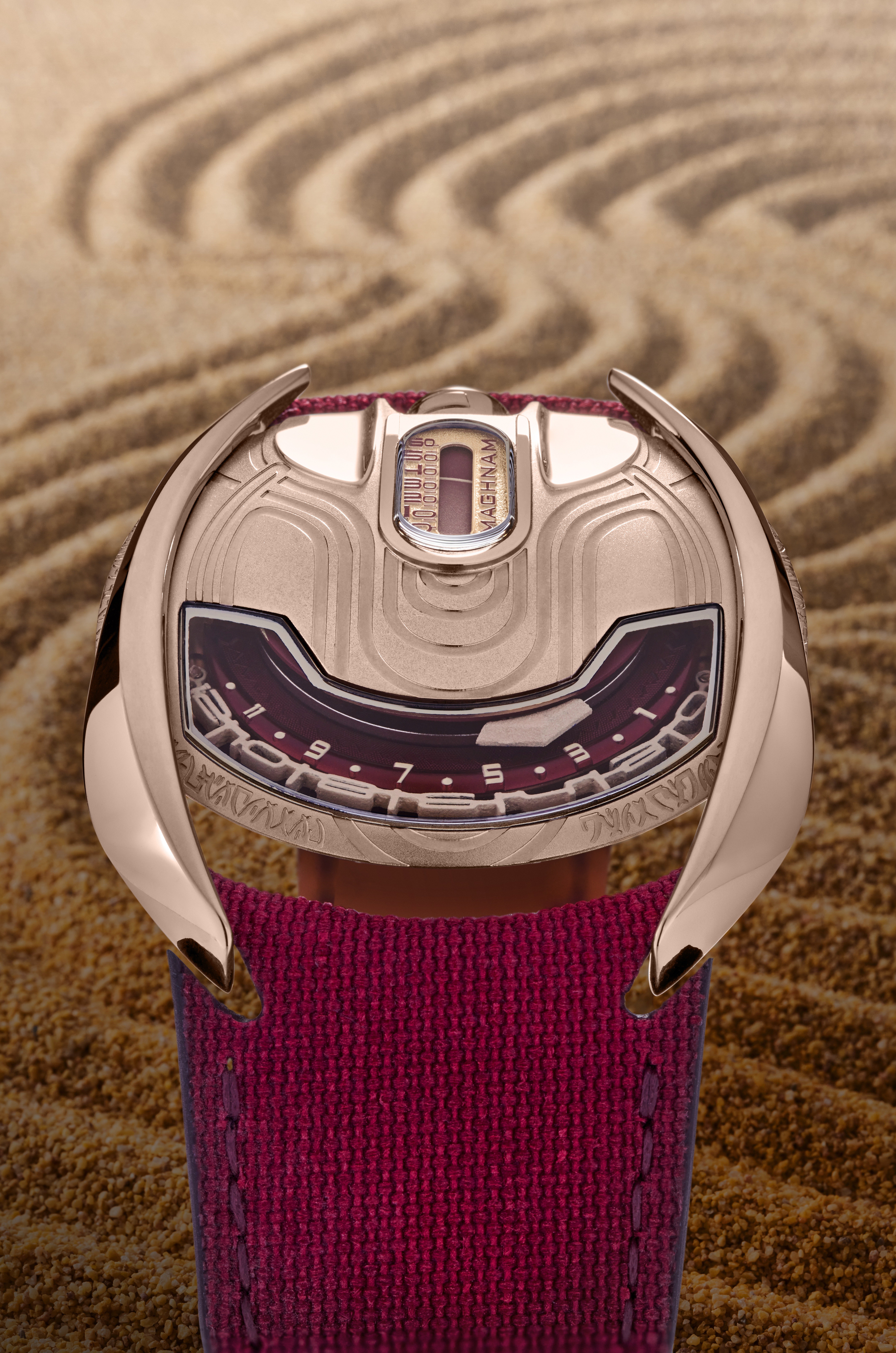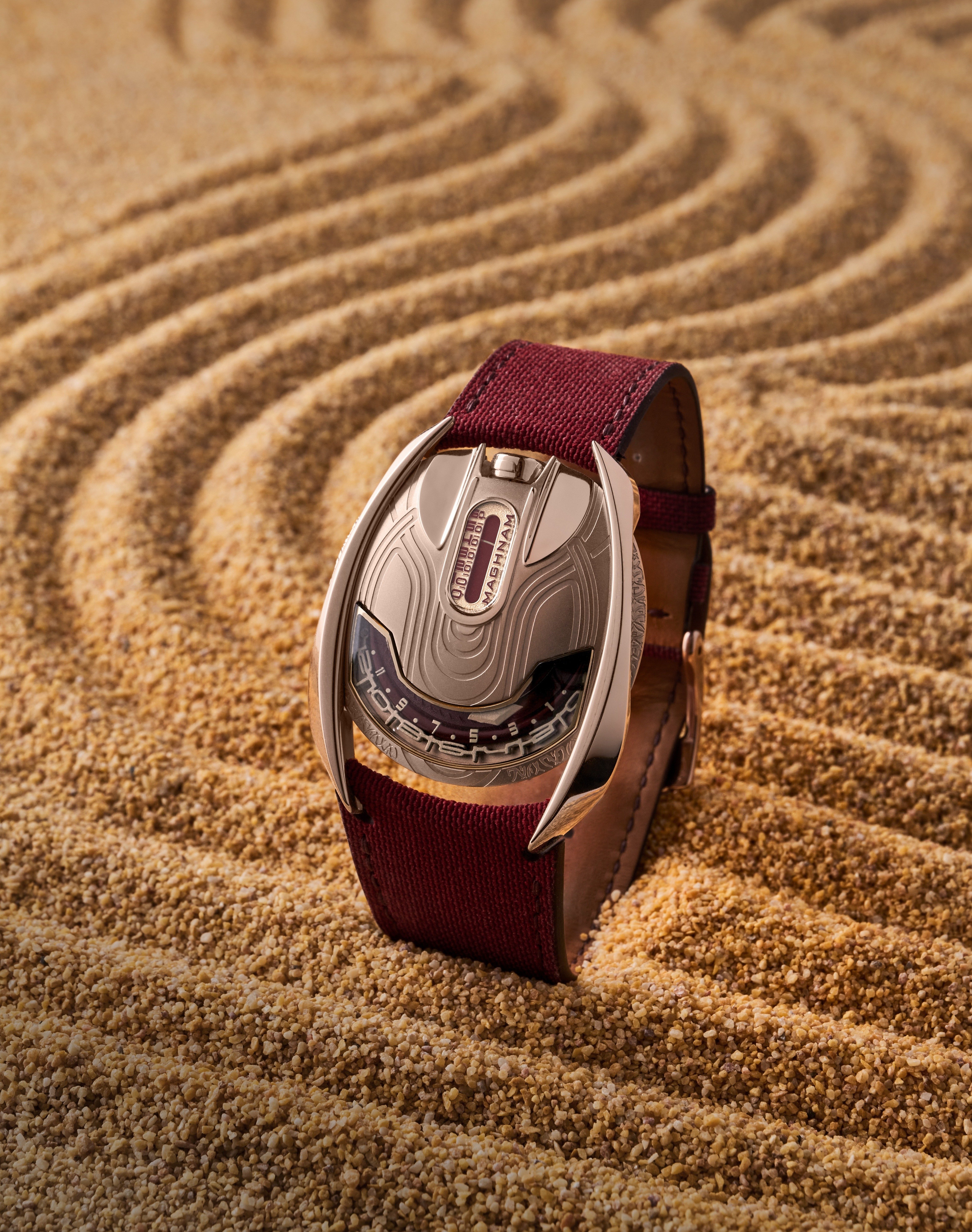 Inside, the movement has been heavily reworked by Sohaib Maghnam himself. Powered by the manual winding MCR01, the base Sellita SW210 calibre has its retrograde jump hour and vertical minutes modules custom designed for a distinctive kinetic expression of time.