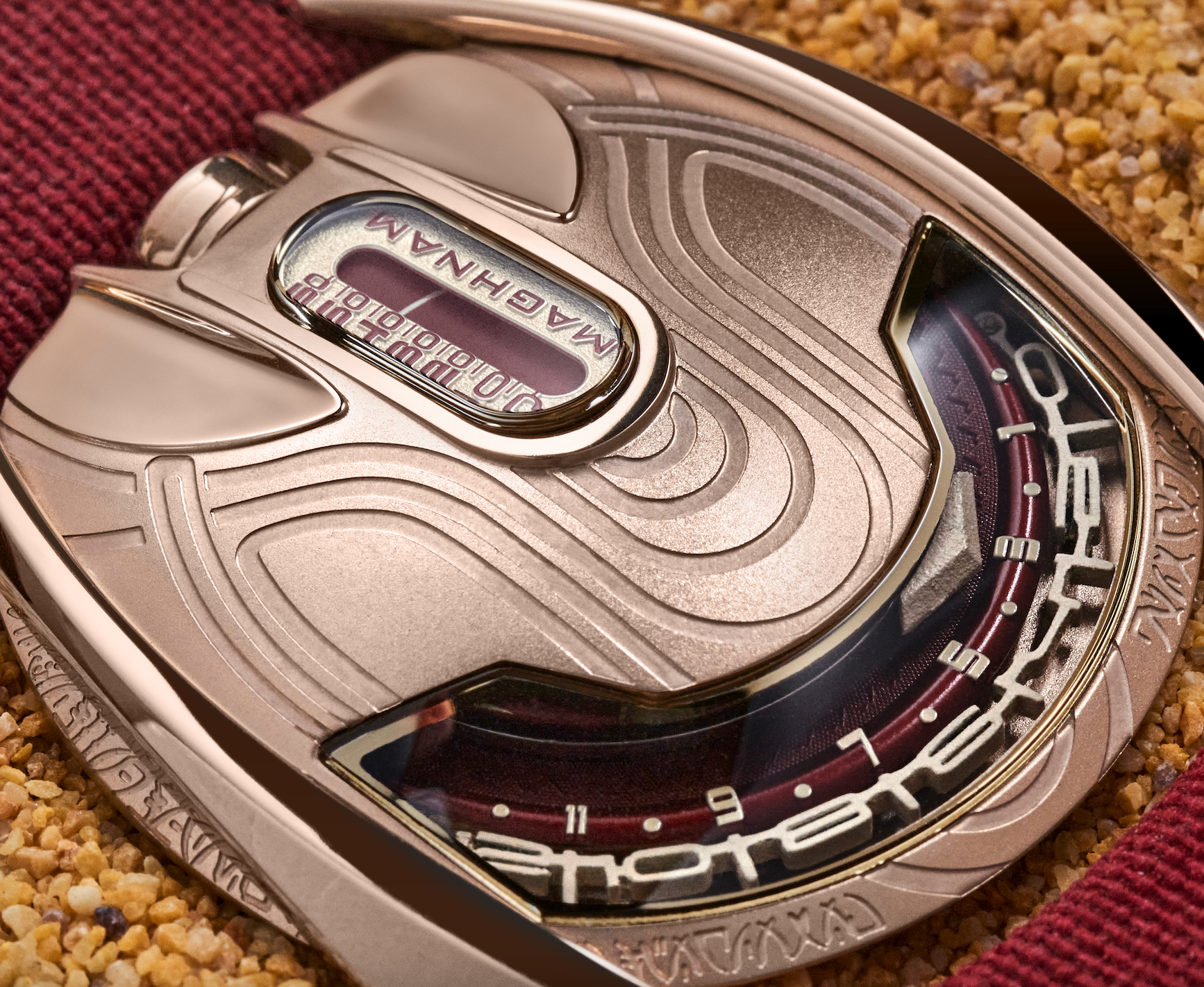 First impressions of the Mohareb are undoubtedly striking. It is an ultra thin shaped watch inspired by historic warrior helmets that transforms time into a kinetic language through the use of a retrograde jump hour and a vertical minute indicator. Each of our collaborative watches features a unique engraved pattern meant to recall ancient warrior culture expressed through runic symbolism and hieroglyphics. We've named the bronze colorway 'Desert Relic' and the blue 'Ocean Relic' to push this concept just that bit further — as if these watches were future relics buried deep in the desert sand, or at the bottom of the ocean floor, left behind for distant explorers.