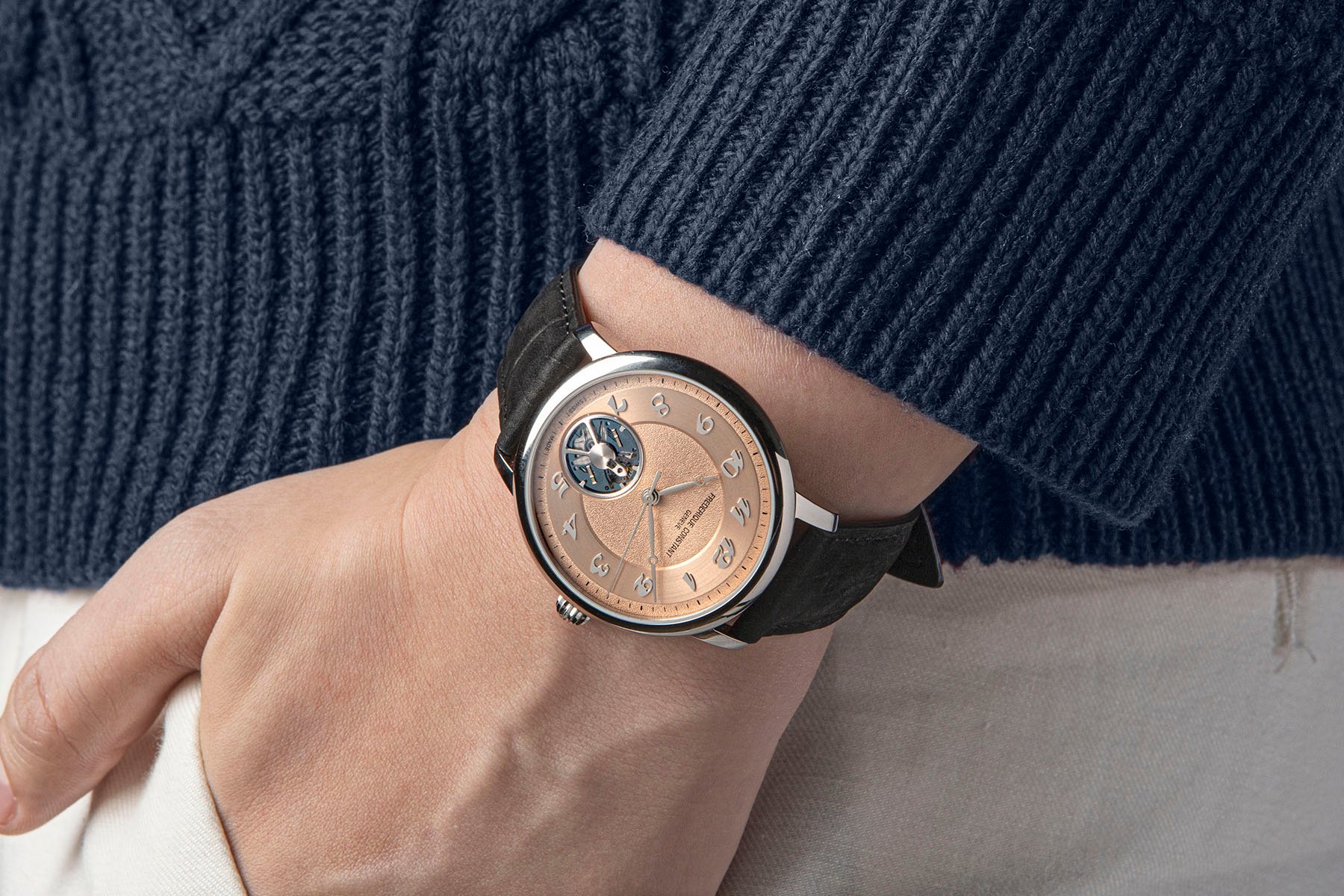 Another watchmaker would have been tempted to house this dizzying new oscillator in a futuristic case. Frederique Constant, however, understands the imperatives of the classic. The 40mm stainless steel case is executed in a timeless style.