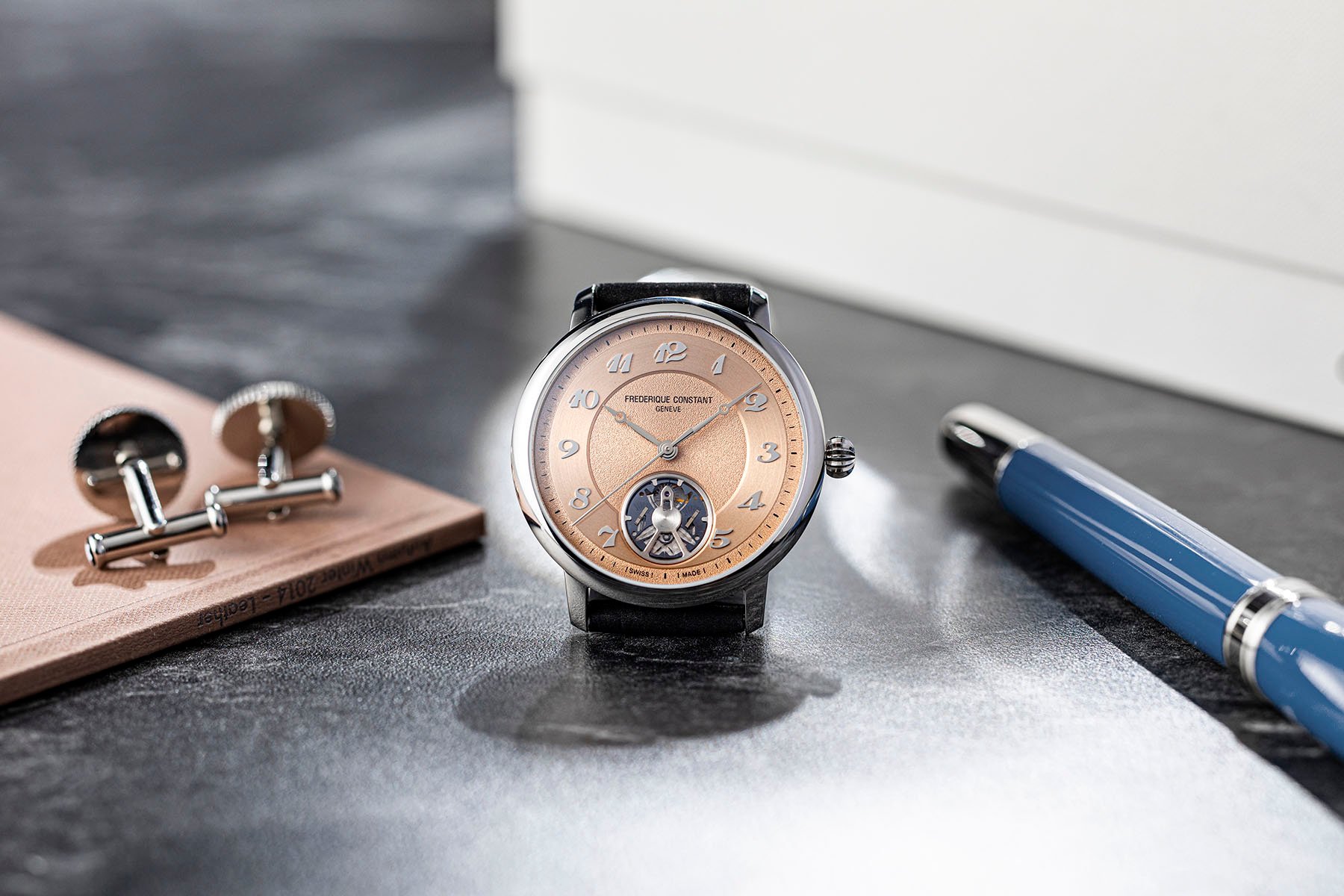 This watch dares to reimagine the traditional Swiss lever escapement, and replaces 26 separate components — including the escapement, balance wheel, hairspring and anti-shock system — with a single piece of silicon. This audacious technical marvel is housed in a watch that is every inch the classicist. The finely finished salmon dial is inspired by the perfect summer rosé, and the Breguet numerals are a reminder of the traditions that make watchmaking so exciting. The Frederique Constant x Revolution Slimline Monolithic FP(S), where the future and the past combine.