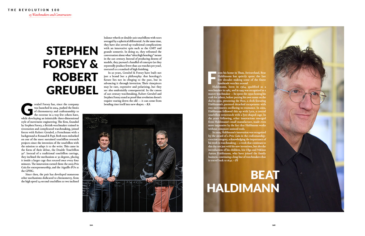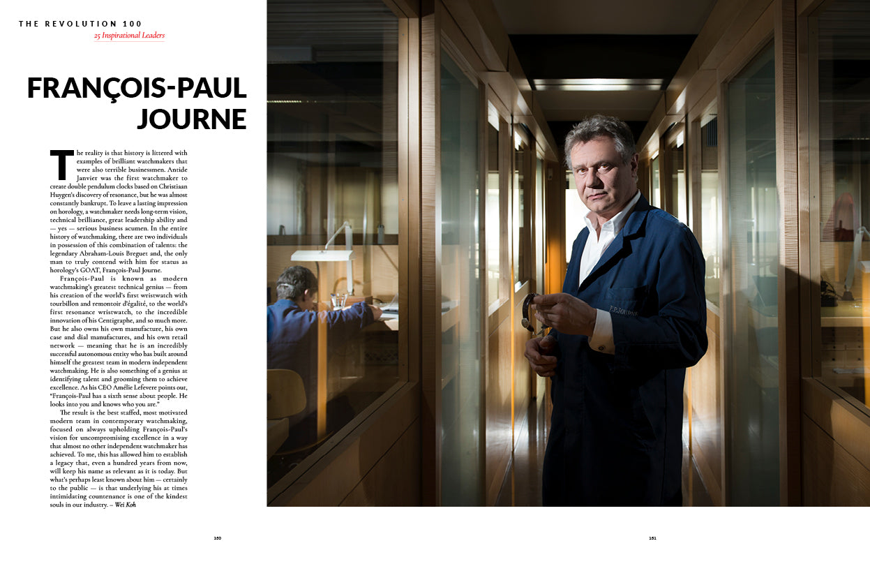 This issue also commemorates 20 years of Revolution since its founding by Wei Koh in 2005. Originally a regional publication in Singapore, it has since become a global phenomenon and to mark this personal milestone, we celebrate the people and ideas that have helped shape watchmaking in the first quarter of the new millennium. To that end, we look back on 100 of the most influential figures and innovations in contemporary horology — from visionary leaders and master artisans to the pioneering timepieces and inventions that have helped to define the past 25 years.