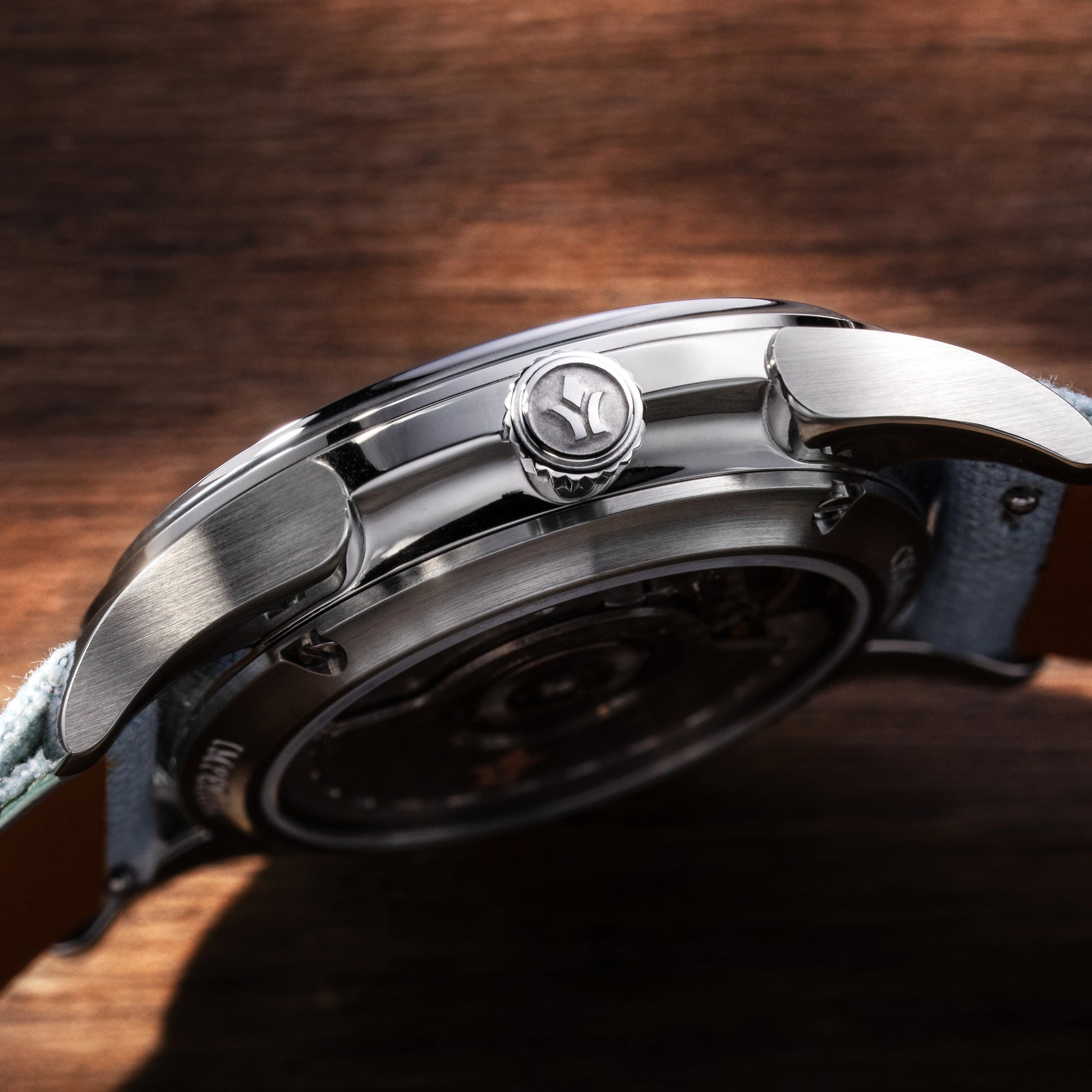 Each model is housed in a 38mm x 10.1mm 316L stainless steel case with Celadon’s signature teardrop lugs, designed for an elegant and refined presence on the wrist. Though compact in diameter, the extended lugs give the watch a presence closer to 39mm, making it versatile for various wrist sizes. The case is topped with a domed sapphire crystal and secured by a screwed sapphire caseback.