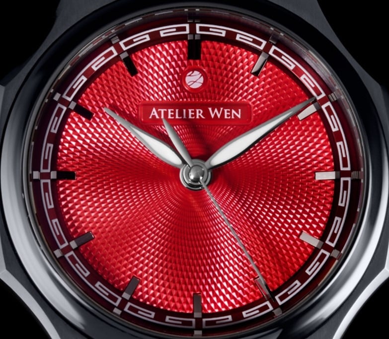 Other hallmarks of Atelier Wen remain present in '鸿 Hóng'. It presents the same intricate diamond-structured guilloché à main dial from our last release, ‘粹 Cùi’, which is the most complicated pattern ever put out by the brand. Handcrafted in Master Cheng's workshop, it requires relay-style coordination between three artisans for a combined total of 36 hours of work. It's rendered in a jubliant shade of red that contrasts wonderfully with the blue-grey undertone of tantalum.