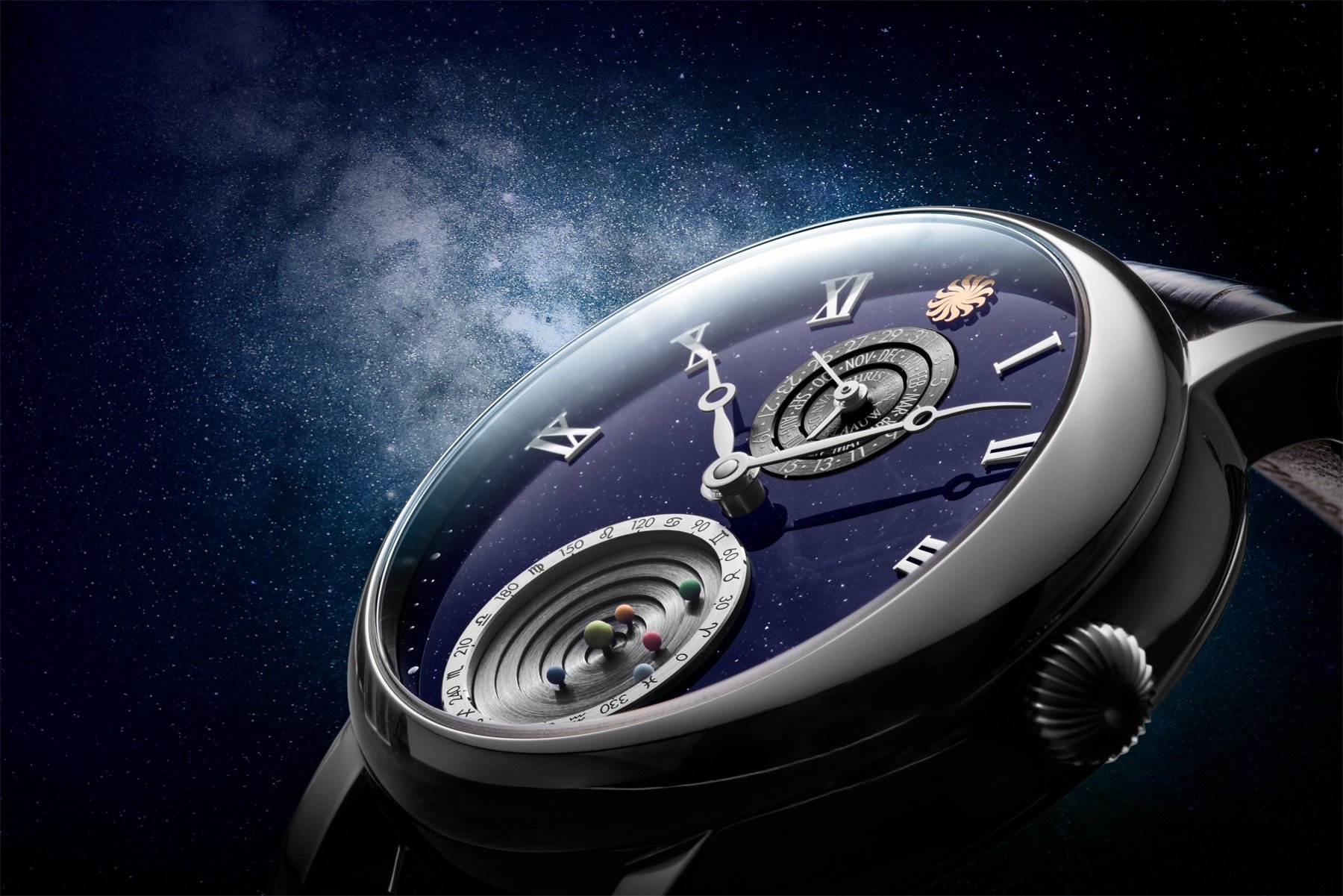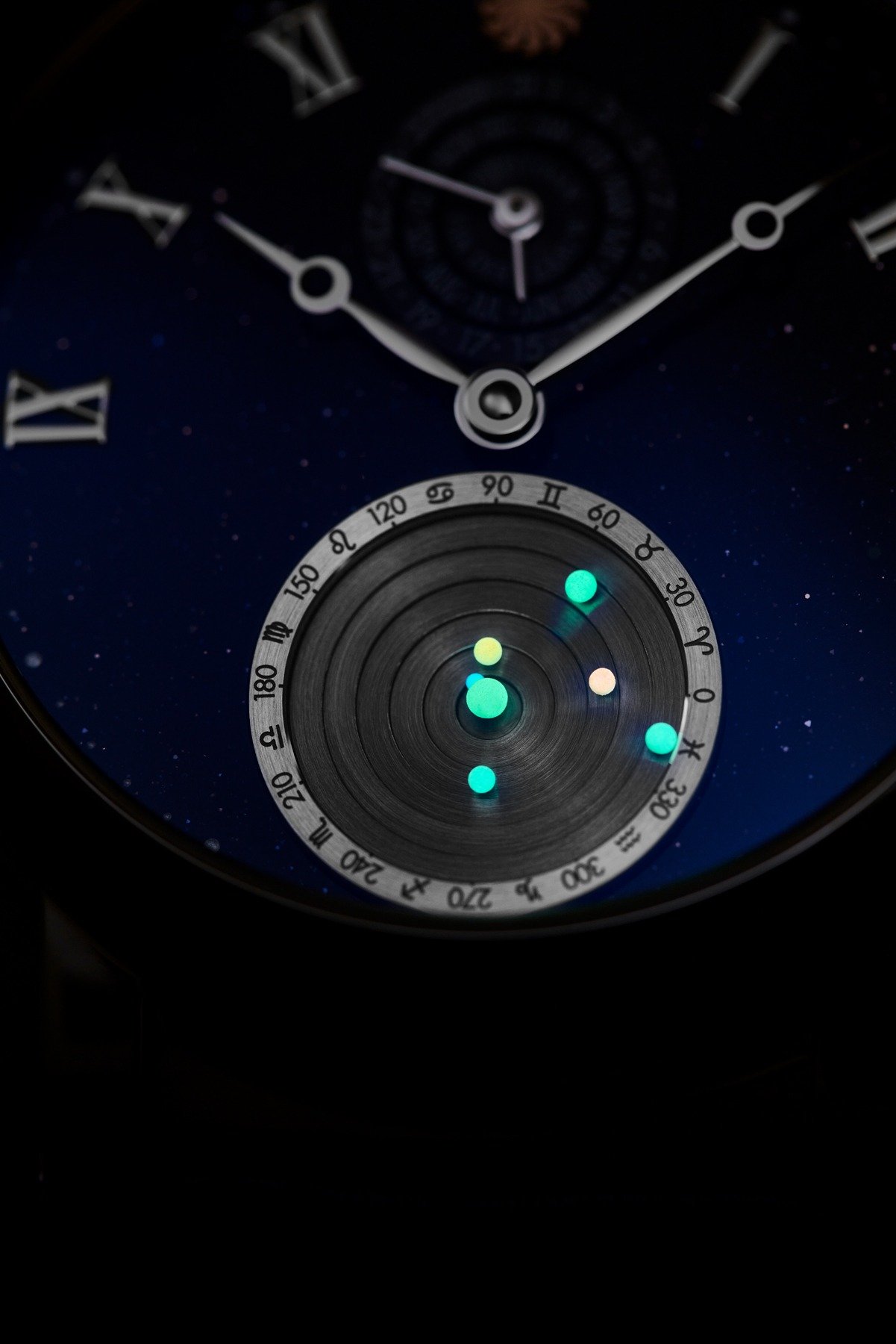 The marvelous miniature planetarium that displays the orbits of Mercury, Venus, Earth, Mars, Jupiter and Saturn around the Sun in real time. The spheres in the Planetarium Prometheus are made of stainless steel that have been hand painted with Super-LumiNova, with a green luminous sphere in the center, representing the Sun. The relative sizes of the simulated planets are proportional to their actual sizes in the solar system, and their motions are depicted in real time. The planterium module is entirely produced in-house at the brand’s workshop in Naarden in The Netherlands.