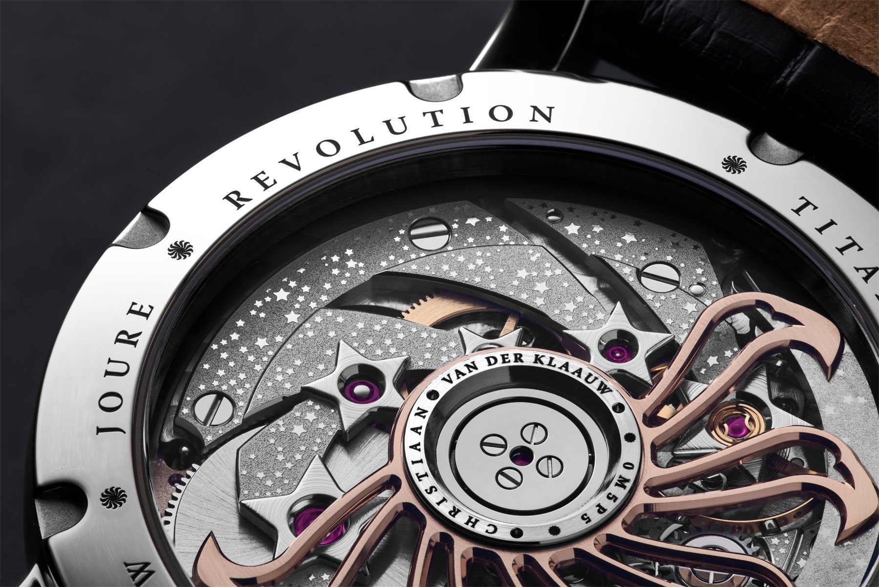 The Planeterium Prometheus features Christiaan van der Klaauw's proprietary movement, which has been produced, finished and assembled in-house. The hand-finished calibre features remarkable details like frosted star patterns on the bridge, adorned with raised stars, circular graining on each star and perlage finishing on the baseplate. Look closely, and you'll notice that the extended finger bridge is tipped by a star to form a stylized depiction of a shooting star. The details you discover with each repeated inspection are truly out of this world.