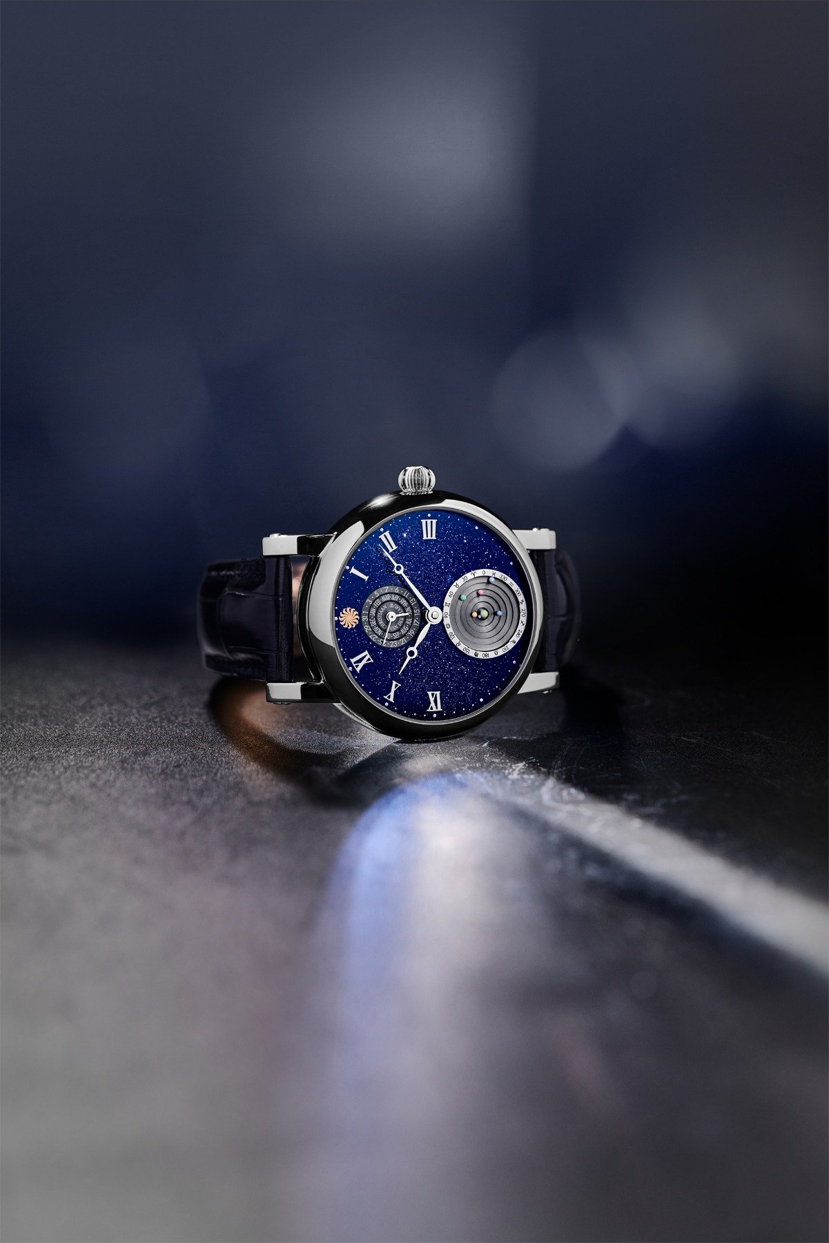 To evoke a star-studded night sky, the dial is made from aventurine glass, which contains metallic inclusions to achieve the glittery effect. Rhodium-plated roman indexes are applied from nine to three o’clock with the brand’s sun logo marking noon. At the top of the dial is a concentric calendar display where the date and month are indicated by co-axial hands.