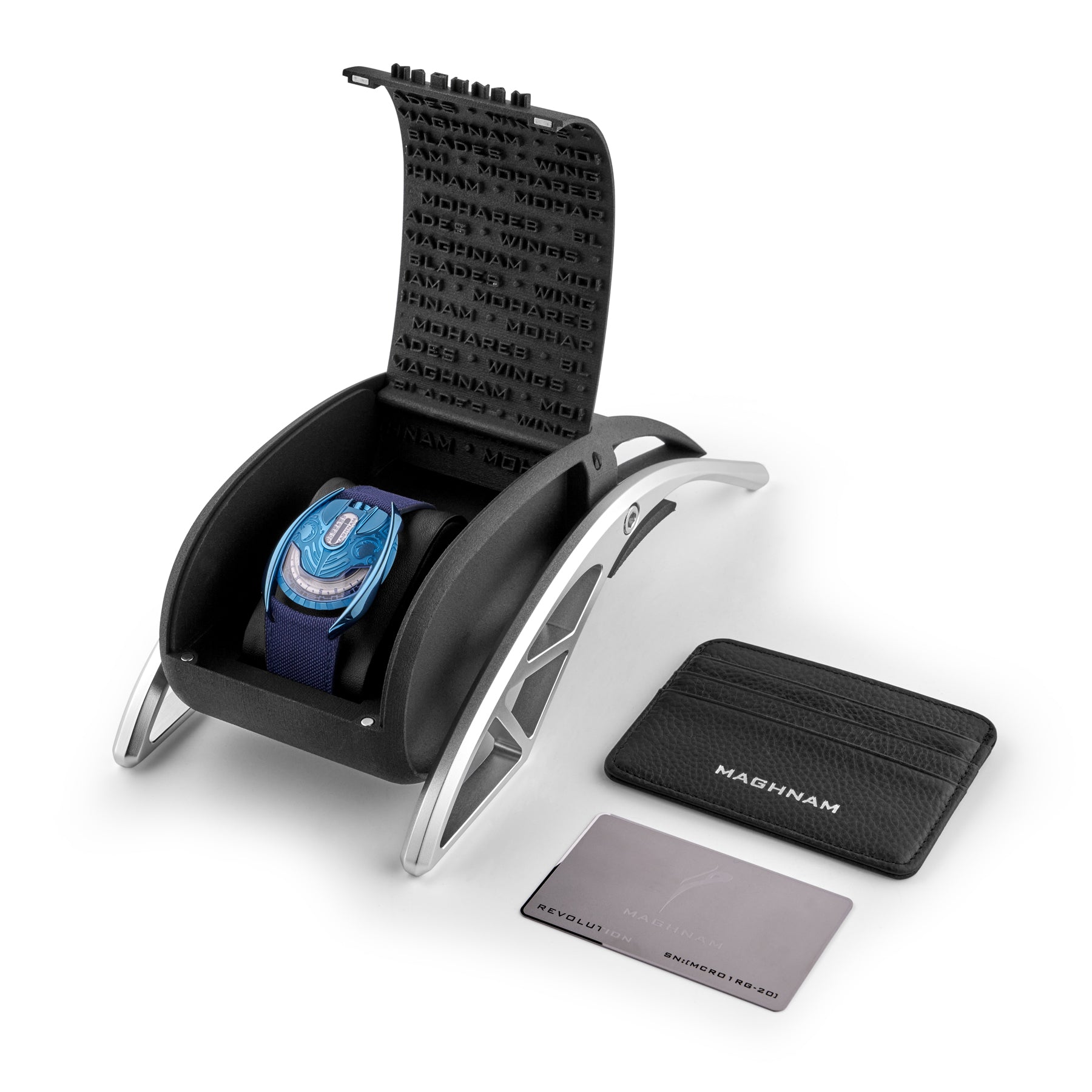 Unlike many avant-gardist, modernist watches in this category, the Mohareb is distinguished by its extraordinary refinement thanks to its extremely slim profile measuring just 8.6mm in height. In fact, the top plate measures just 0.25mm; any thinner and its structural integrity would have been compromised. This slimmess was achieved through unconventional means: Maghnam eschewed traditional manufacturers and turned to a company that CNC machines surgical tools in order to accomplish this. The result are striking proportions that retain a sense of elegance that complements the futuristic aesthetic.