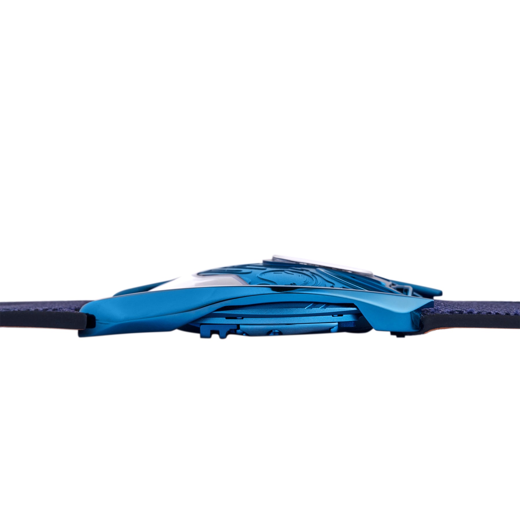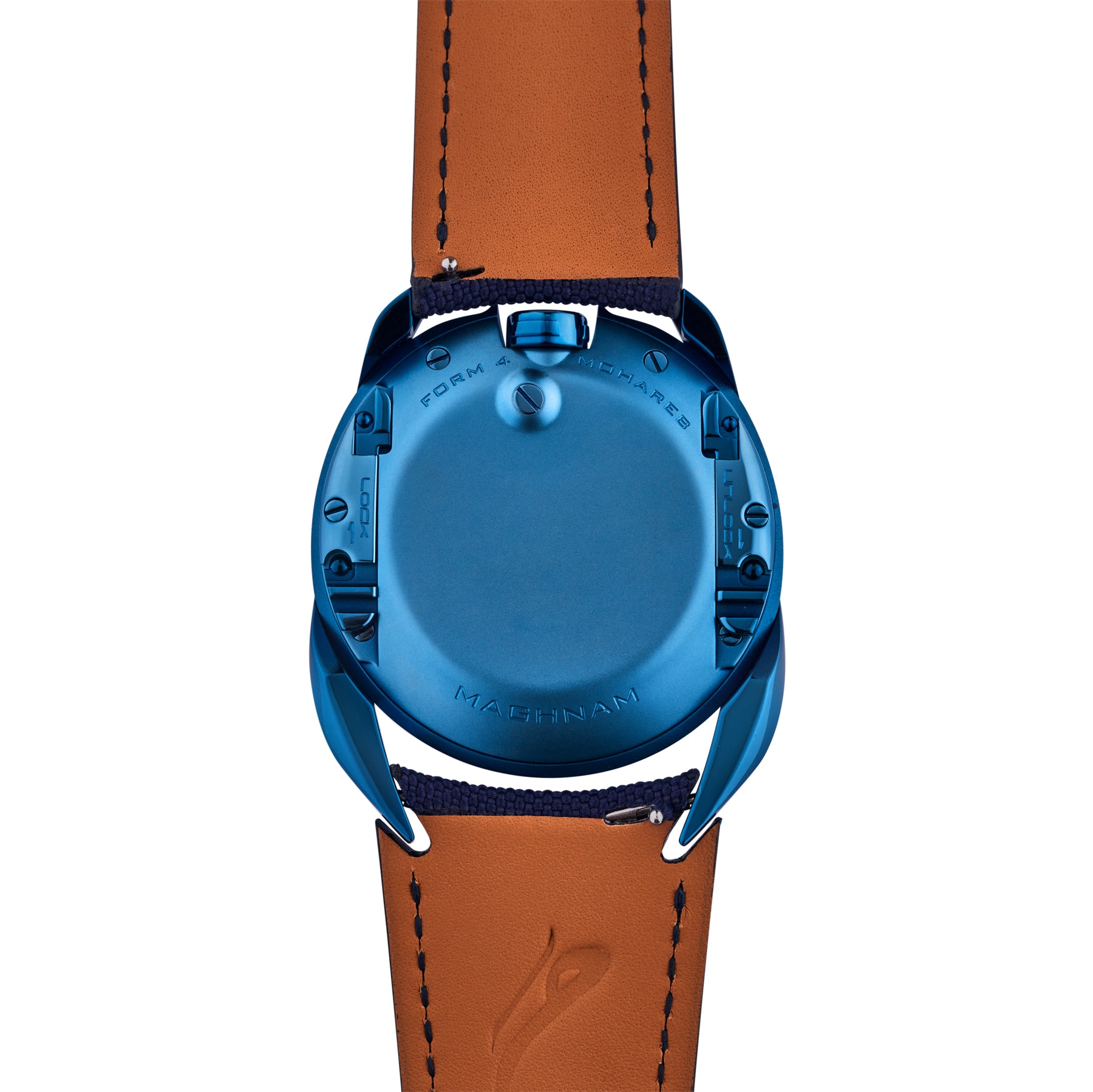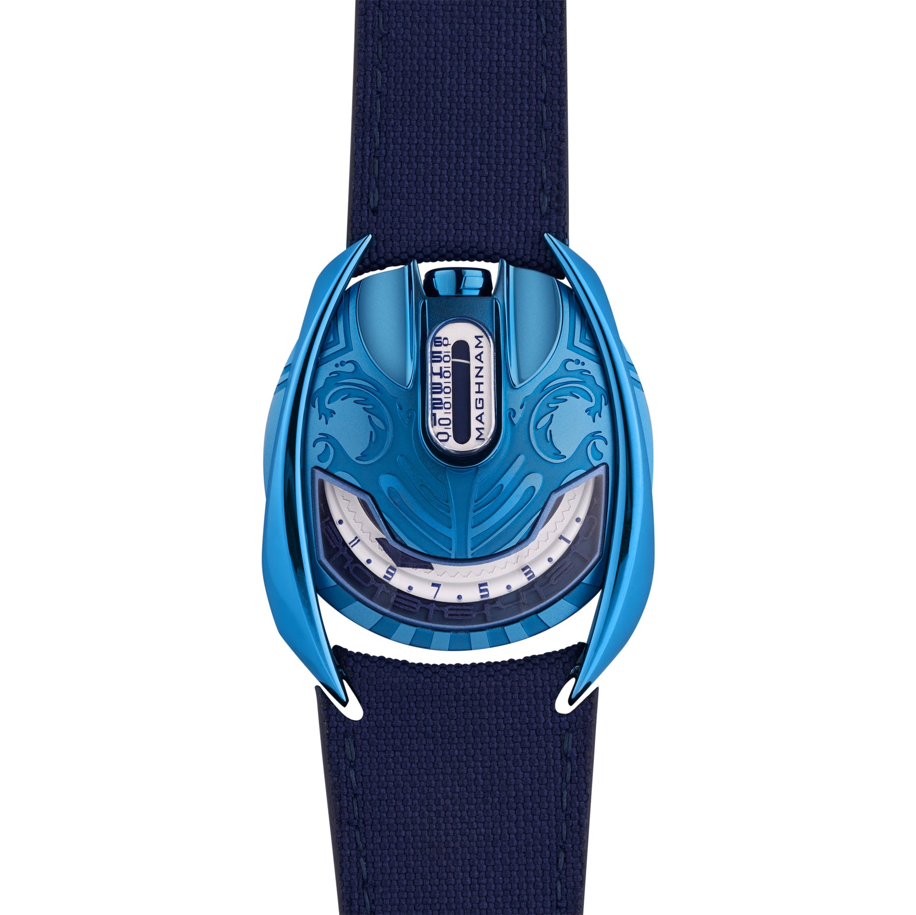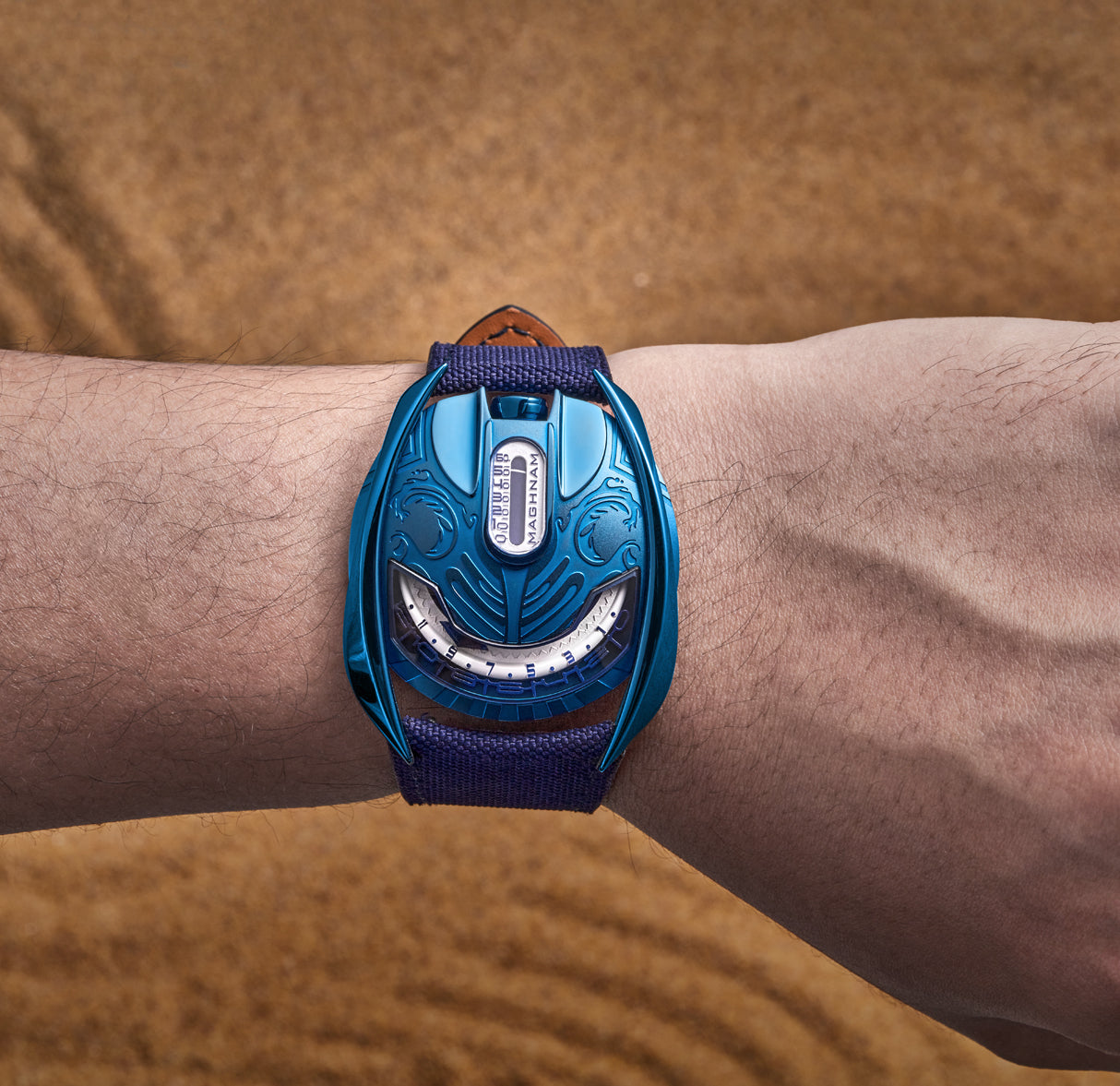 First impressions of the Mohareb are undoubtedly striking. It is an ultra thin shaped watch inspired by historic warrior helmets that transforms time into a kinetic language through the use of a retrograde jump hour and a vertical minute indicator. Each of our collaborative watches features a unique engraved pattern meant to recall ancient warrior culture expressed through runic symbolism and hieroglyphics. We've named the bronze colorway 'Desert Relic' and the blue 'Ocean Relic' to push this concept just that bit further — as if these watches were future relics buried deep in the desert sand, or at the bottom of the ocean floor, left behind for distant explorers.
