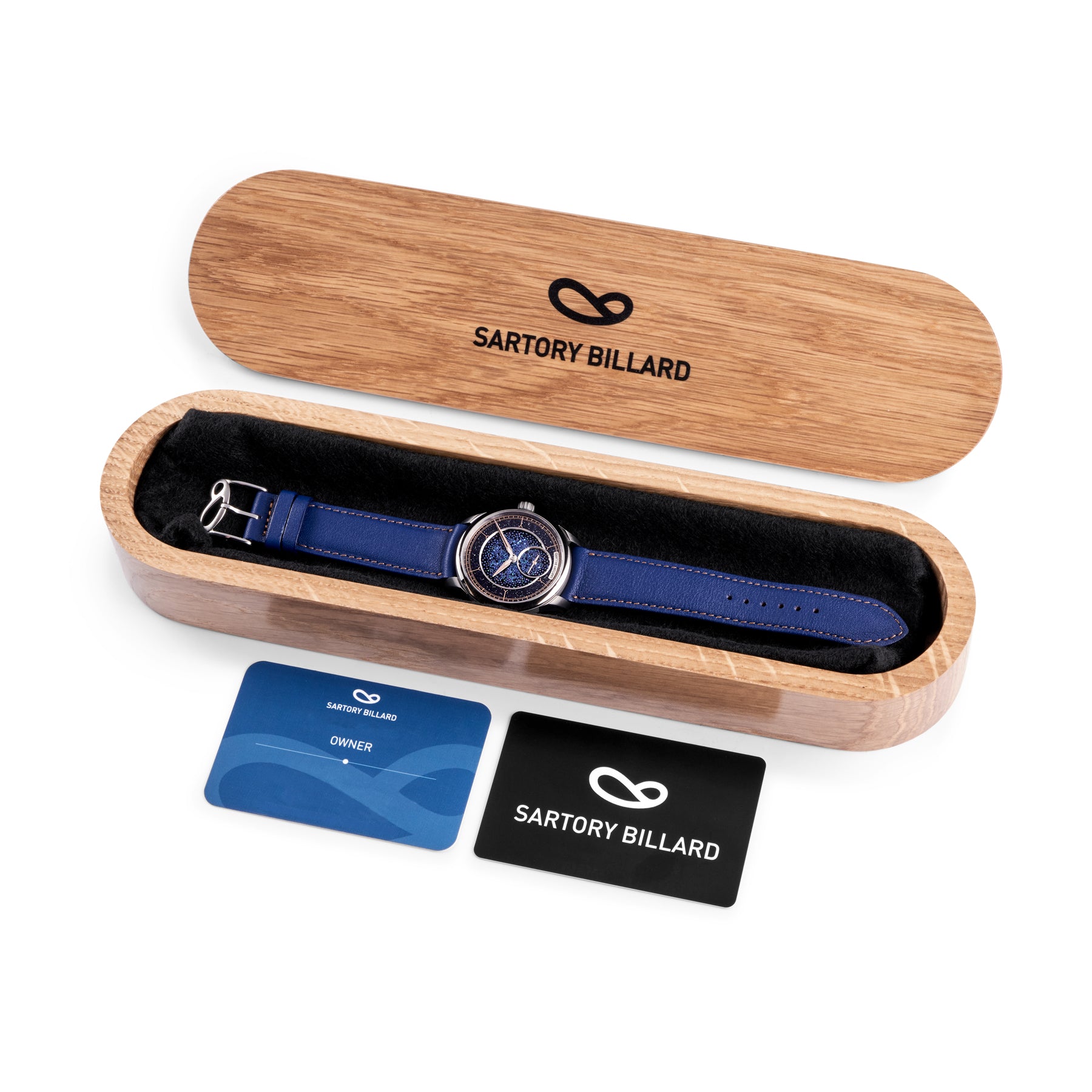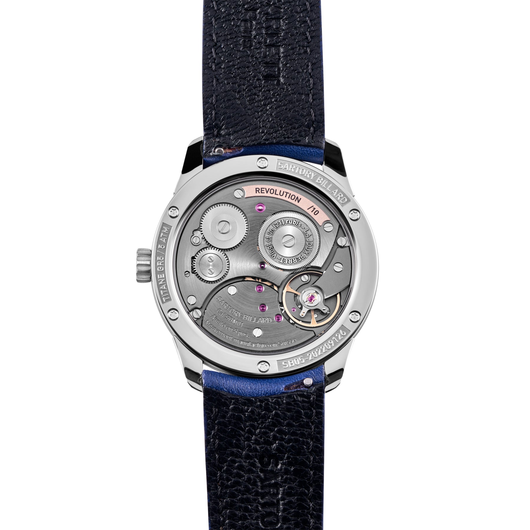 The full titanium build of Uchü translates into an ultra-lightweight wearing experience that parallels its cosmic theme. Offering a fully polished concave bezel, the watch continues with satin brushed lugs and case middle, converging into polished bevels. Likewise, the crown is satin brushed with polished accents highlighting the Sartory Billard emblem.