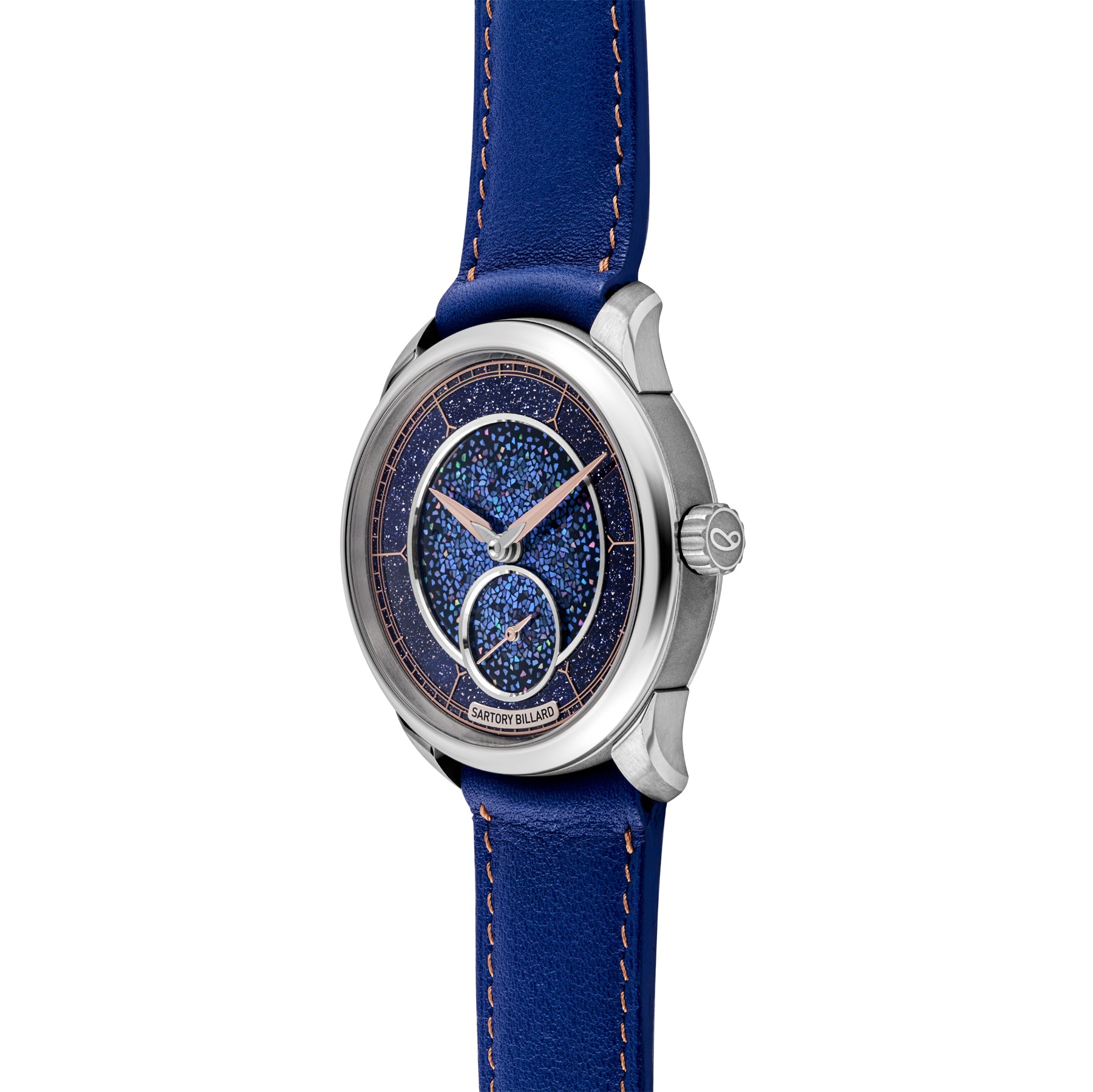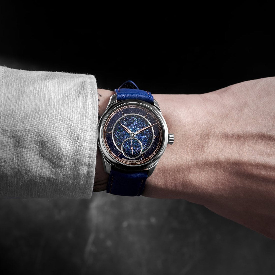 The incredible dial truly rewards repeated observation. The multipart dial construction is slightly recessed against the aventurine chapter ring, with both components further distinguished with the help of brushed metal rings. For the sake of legibility as much as aesthetics, the overarching blue color palette is complemented with rose gold-coated hour and minute hands constructed in two parts, with a striking juxtaposition between the frosted steel base and high polish gold.