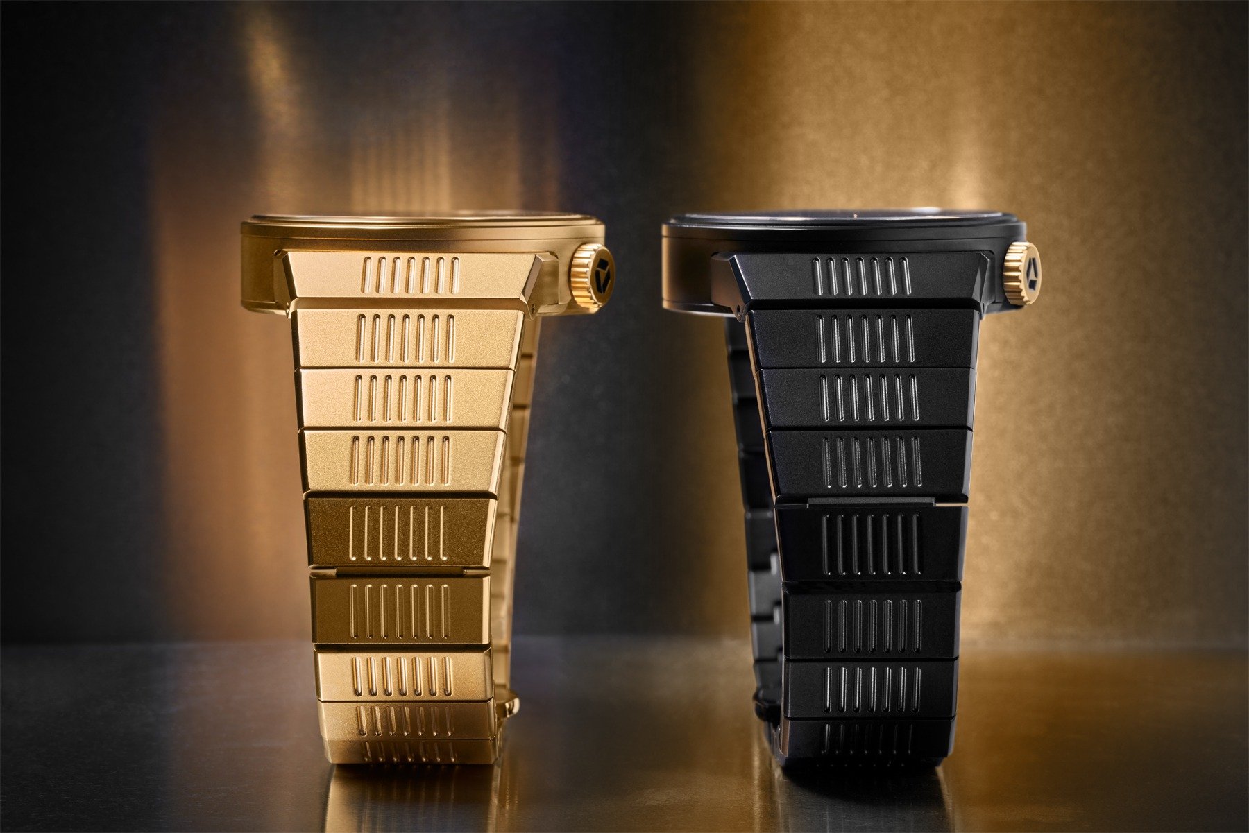 Keep going past the dial, and you'll notice a stepped bezel that completes the circular motif that runs throughout the Worldtimer. The architecturally-minded will draw a line from this to the tiered structure of New York's Guggenheim Museum, the sculptural masterpiece by American architect Frank Lloyd Wright from which the Worldtimer draws inspiration from. This theme flows through to the vapor-blasted 316L stainless steel case, which measures 38.5mm x 10.5mm and PVD coated in gold, while the integrated bracelet utilises a 'lugless' design to crease a sense of architecture on the wrist. At two and four o’ clock, there are two crowns that seem to almost flow into the case, yet are easy to access due to hidden recesses at the base of the watch. The top crown serves to operate the bidirectional city disk and the bottom one is for setting the time and winding the watch.