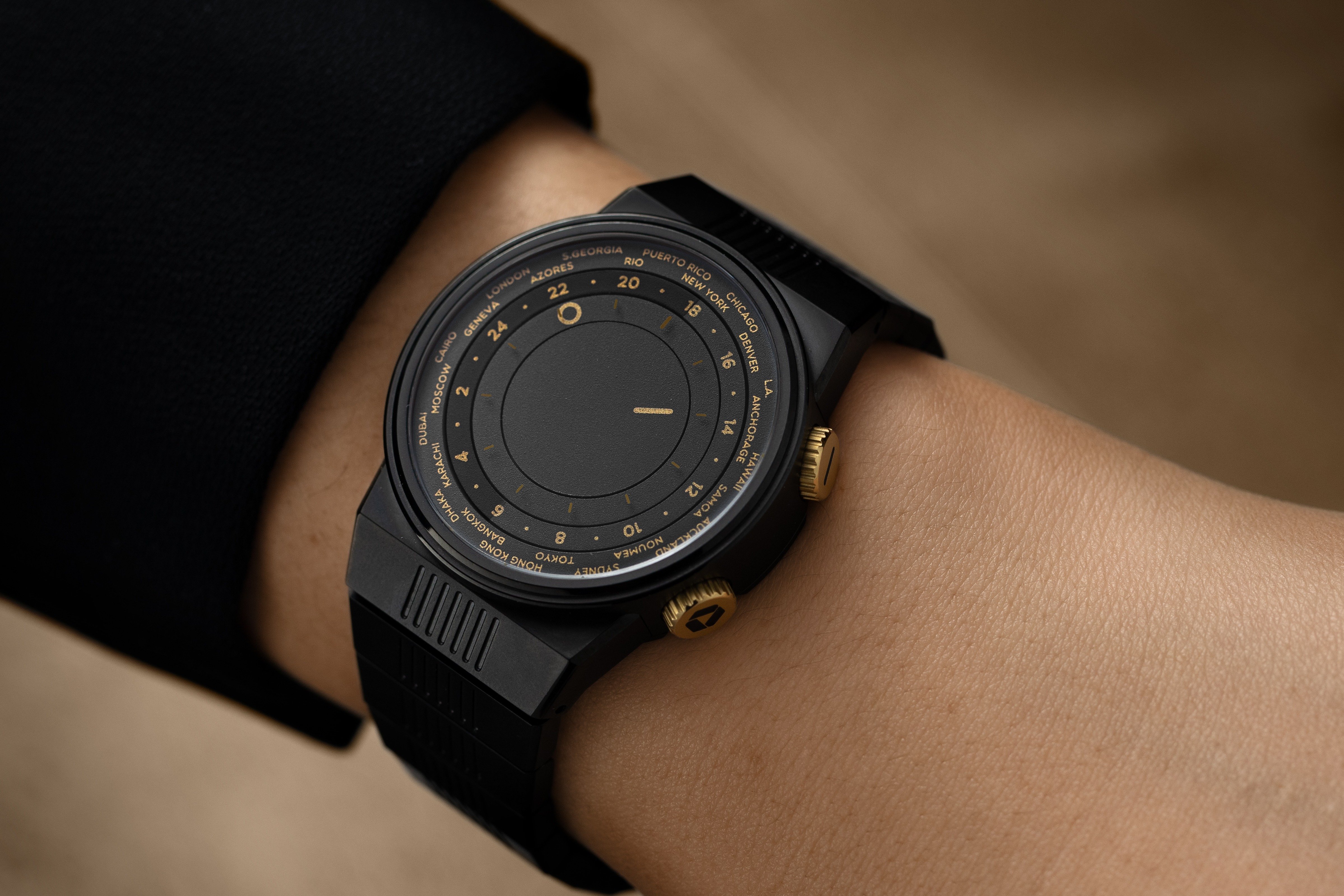 The dial consists of four concentric circles: the innermost dial tracks minutes; the next tracks hours and the following displays the 24-hour time with a day/night indicator. The outermost disk features 24 cities that allow wearers to easily track each timezone. Instead of traditional hands that mark the passing of time, printed graphic elements are instead employed to maintain visual cleanliness.