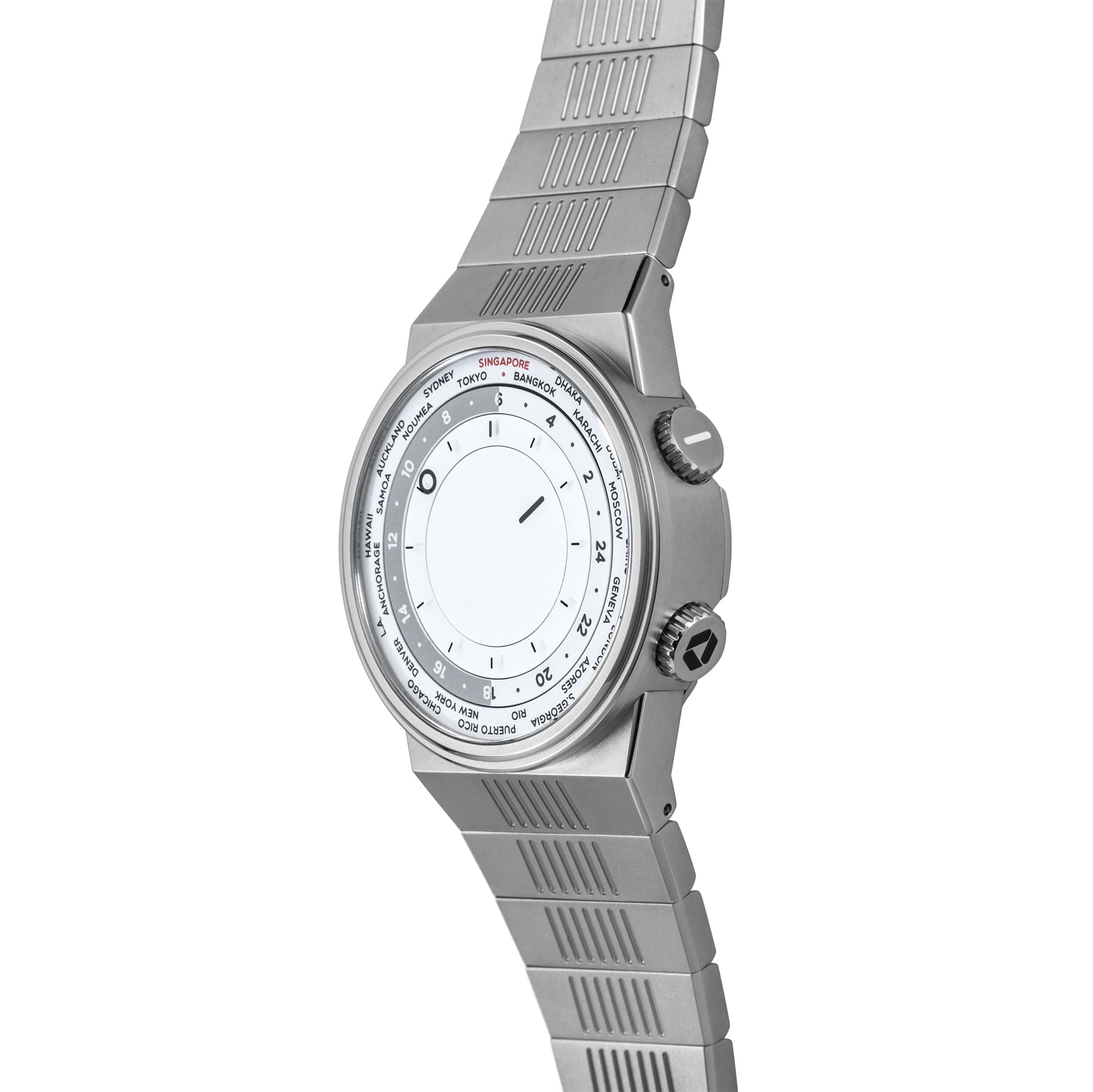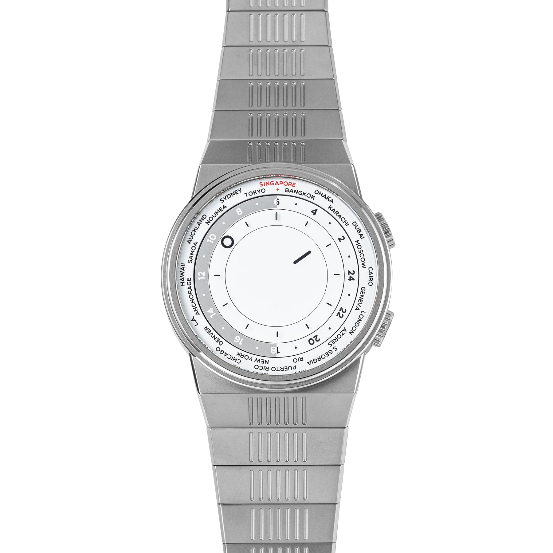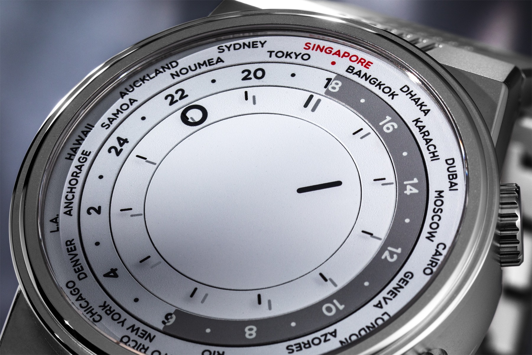 White with four concentric disks, representing hours, minutes and world time; 24 time zones printed on outermost disk, with “Singapore” marked in red in honor of the city-state that is home to Revolution’s founding HQ