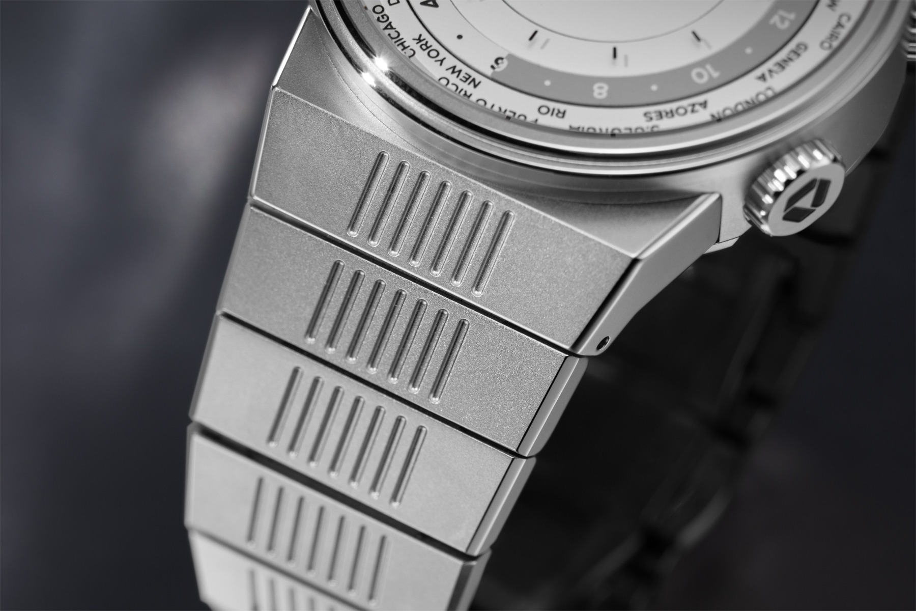 Keep going past the dial, and you'll notice a stepped bezel that completes the circular motif that runs throughout the Worldtimer. Two crowns sit at 2 and 4 o’clock, slightly recessed into the case and bearing a white line and the Alterum logo respectively. The former lets you set the bidirectional city disk while the latter winds the watch and sets the time. Both case and bracelet are vapor-blasted for a softer, more contemporary finish.