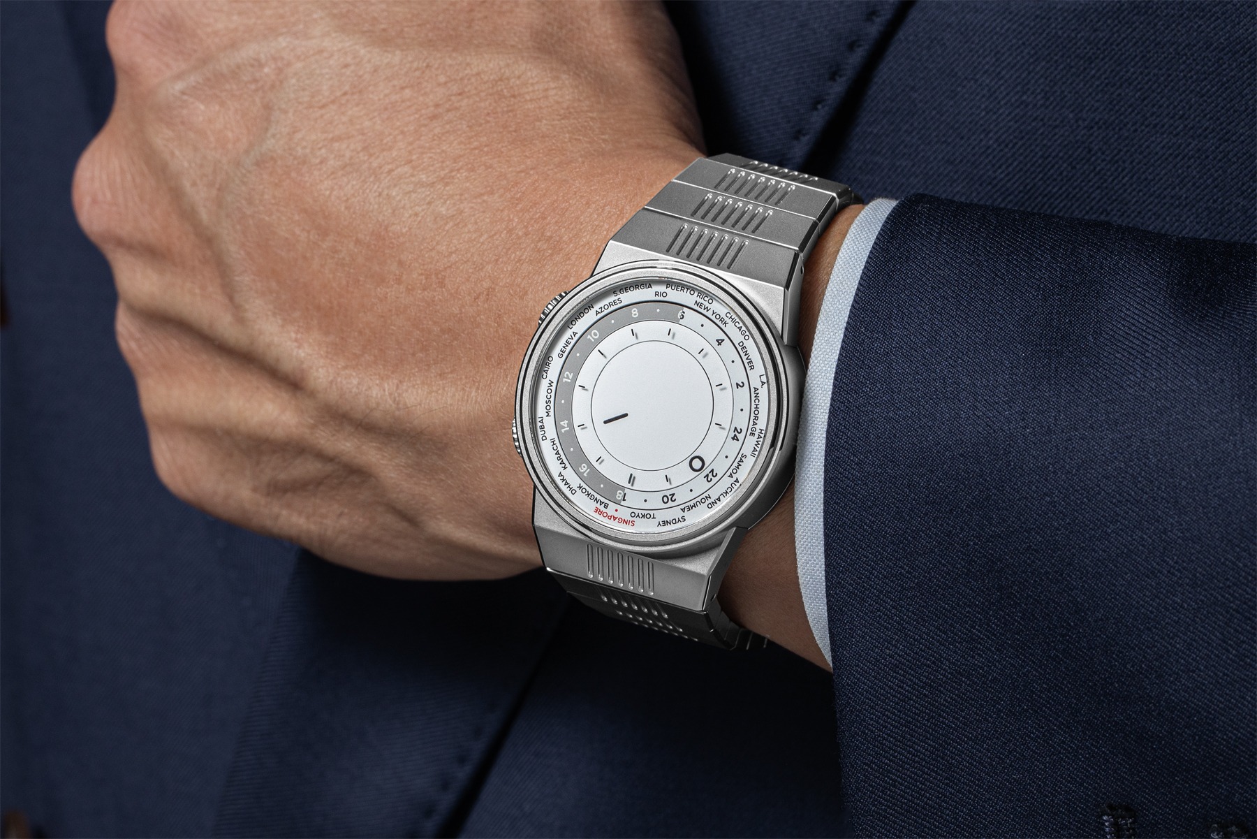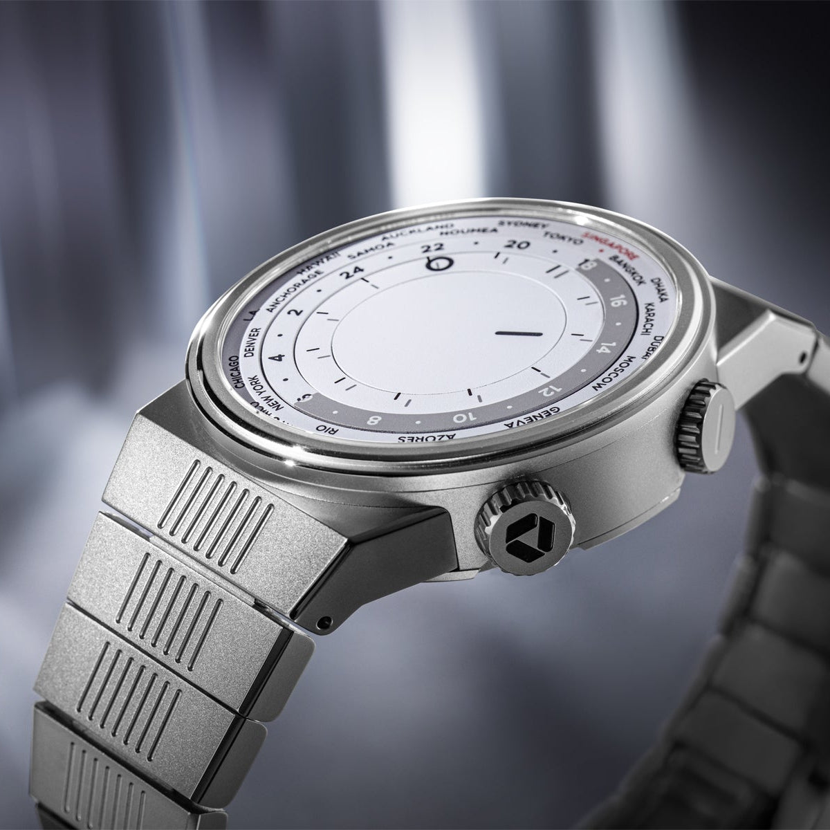 The dial consists of four concentric circles: the innermost dial tracks minutes; the next tracks hours and the following displays the 24-hour time with a day/night indicator. The outermost disk features 24 cities that allow wearers to easily track each timezone. Instead of traditional hands that mark the passing of time, printed graphic elements are instead employed to maintain visual cleanliness.