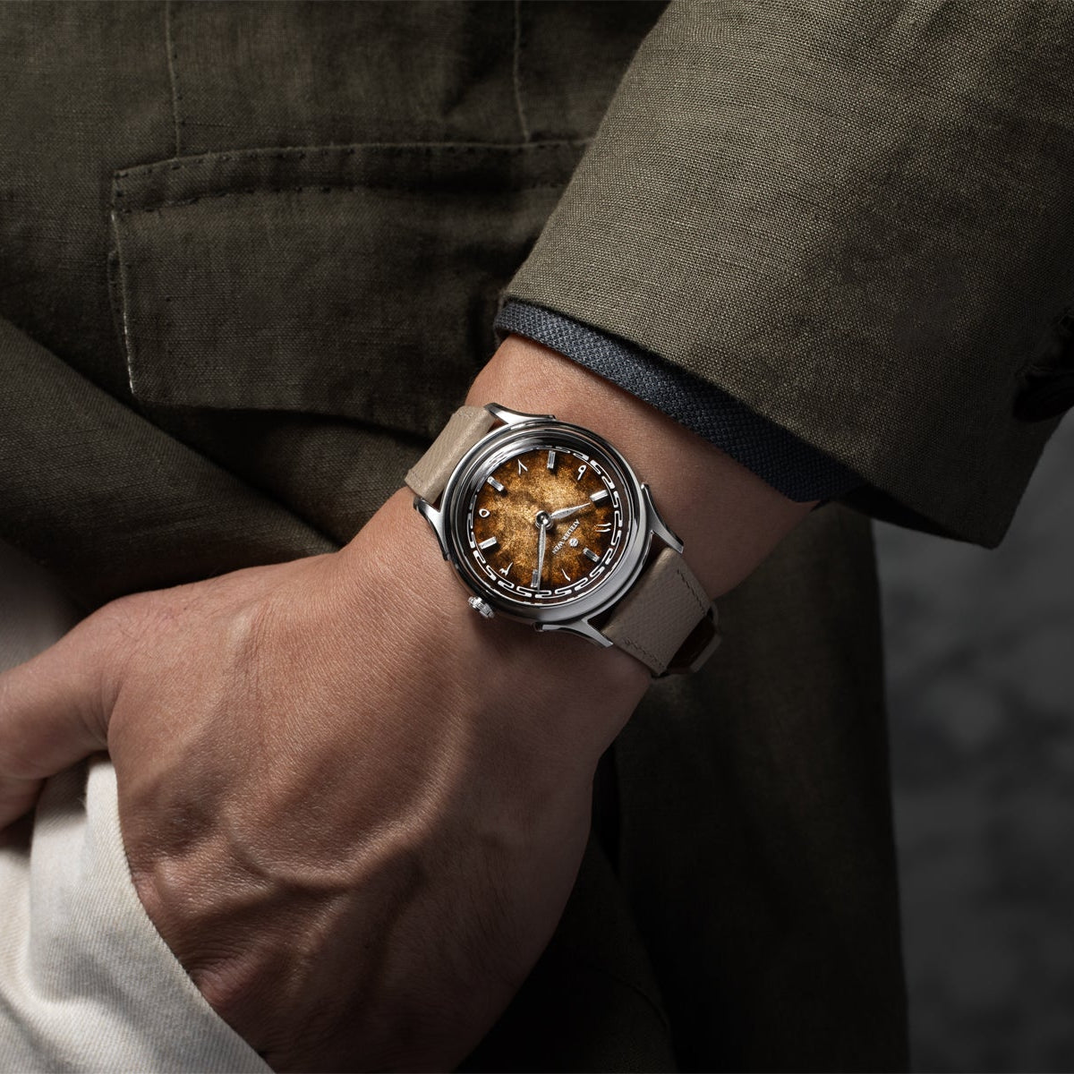 This edition features a stunning fumé grand feu enamel dial, crafted in Beijing by Kong Lingjun. Its gradient shifts from warm desert sand to deep chocolate, achieved through months of experimentation with notoriously difficult brown enamel tones. Beneath it lies a 925 silver gratté-textured base, creating a woven effect evocative of historic silk trade routes. Eastern Arabic numerals and baguette-cut diamond markers add brilliance, while tri-planed rhodium-plated hands catch the light with dynamic reflections.