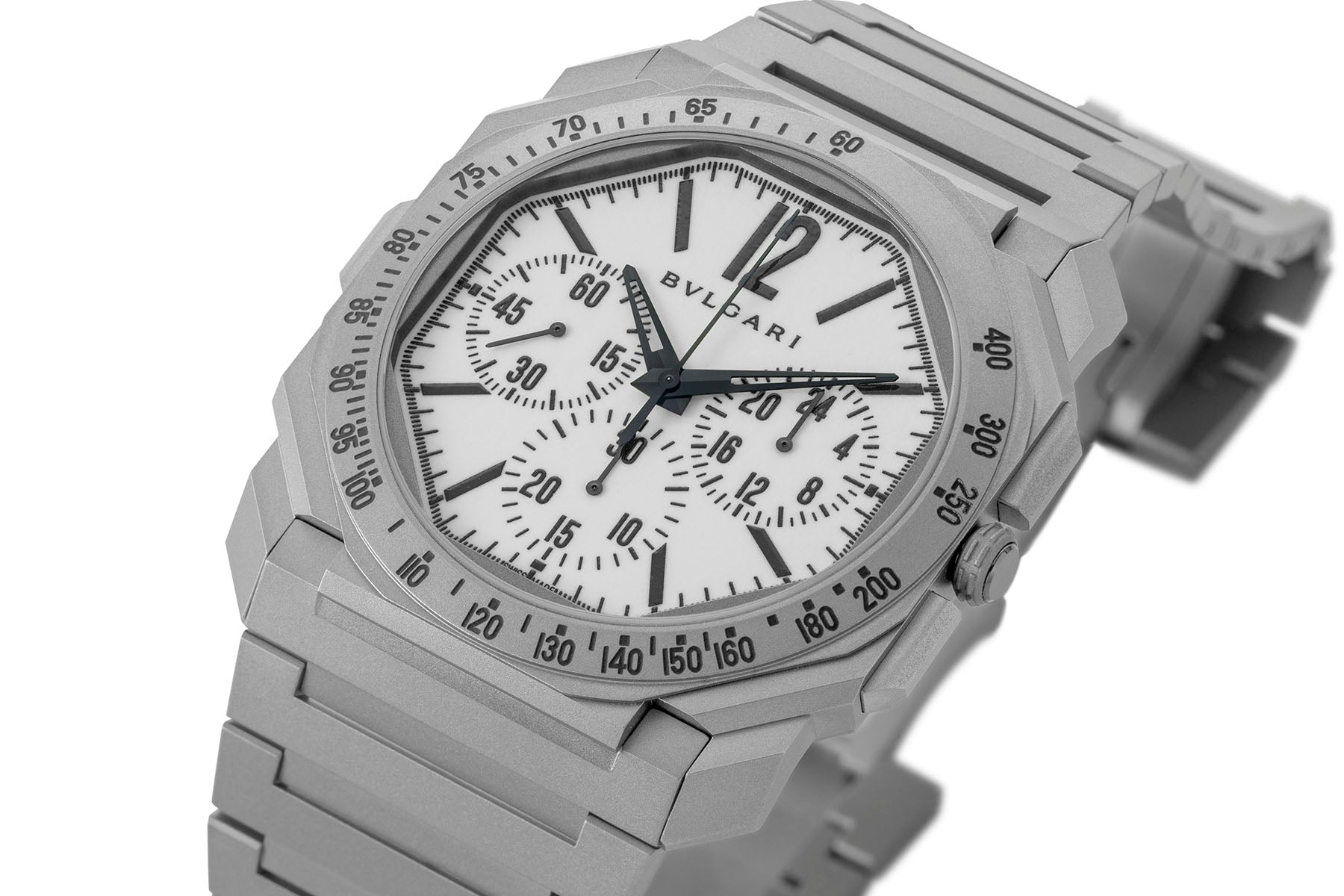 What sets the Bulgari Octo Finissimo Chronograph GMT White Light for Revolution & The Rake from the original is firstly, the engraved and printed tachymeter scale on the bezel of the watch. Secondly, and most strikingly, its 0.2mm dial is entirely painted with lume so that the markers on it are illumated in the dark in negative relief.