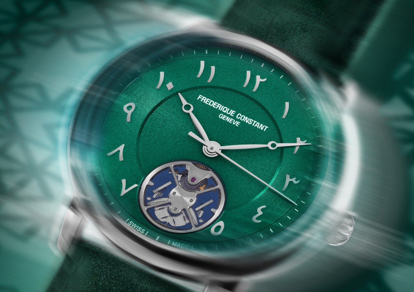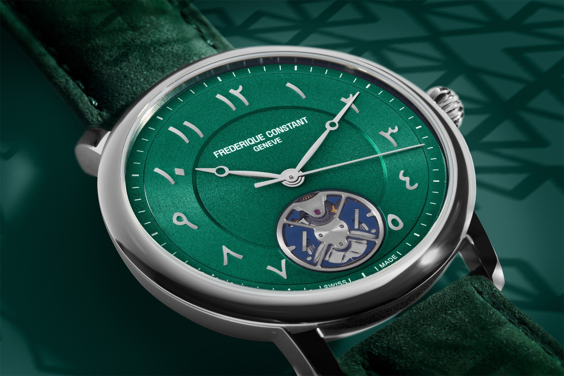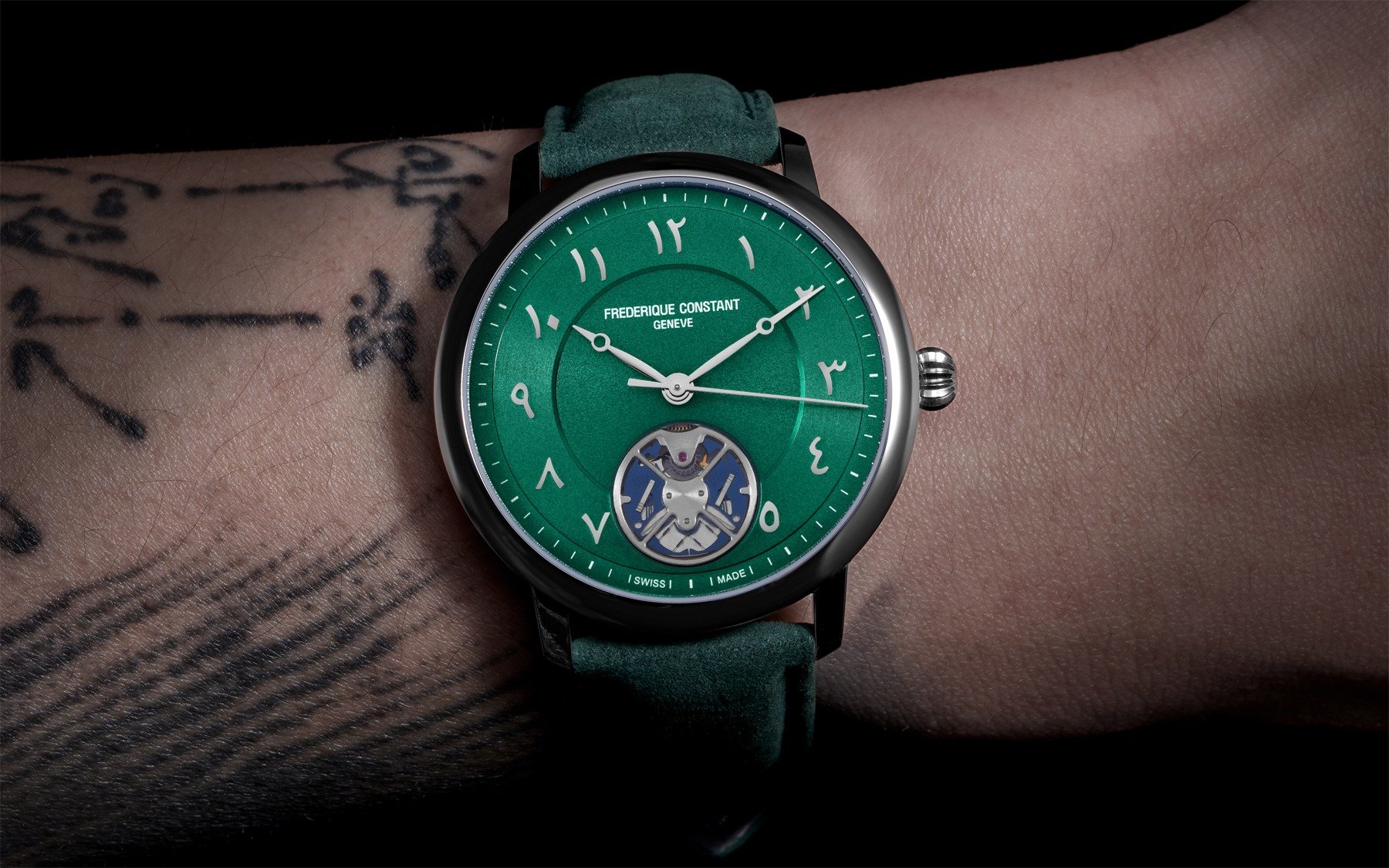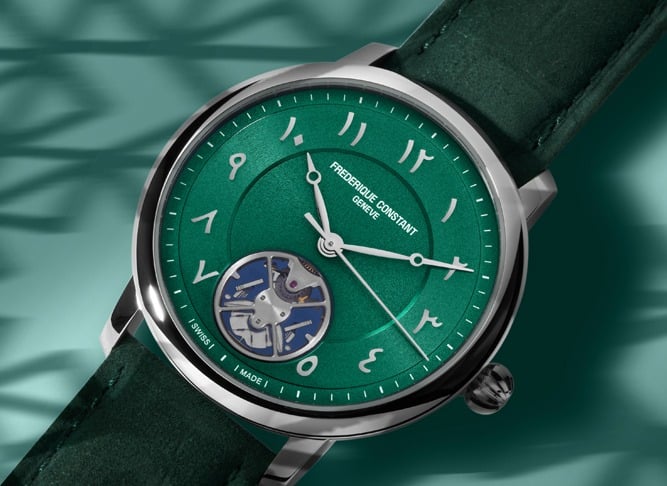 Following the success of the first sold-out collaboration, the Frederique Constant × Revolution Slimline Monolithic Manufacture FP(G) presents a green dial, Breguet hands and applied Hindu-Arabic numerals to celebrate Revolution Arabia, the latest addition to our growing international roster. This collaborative release also marks the final iteration of the Slimline Monolithic Manufacture to be produced in this form, with future variants of the model set to feature a different movement as part of a distinctly upmarket proposition.