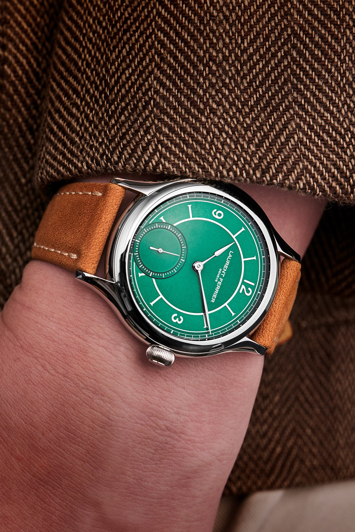 The stunning shade of green isn’t the only remarkable note on this dial. This watch sees the sector track — in addition to the numerals — being crafted from white rhodium-treated gold, applied to the dial, rather than printed.