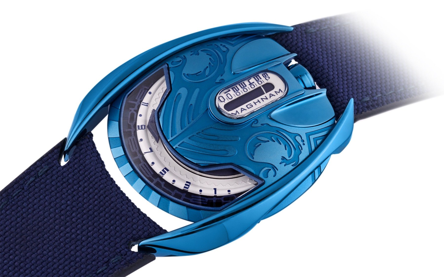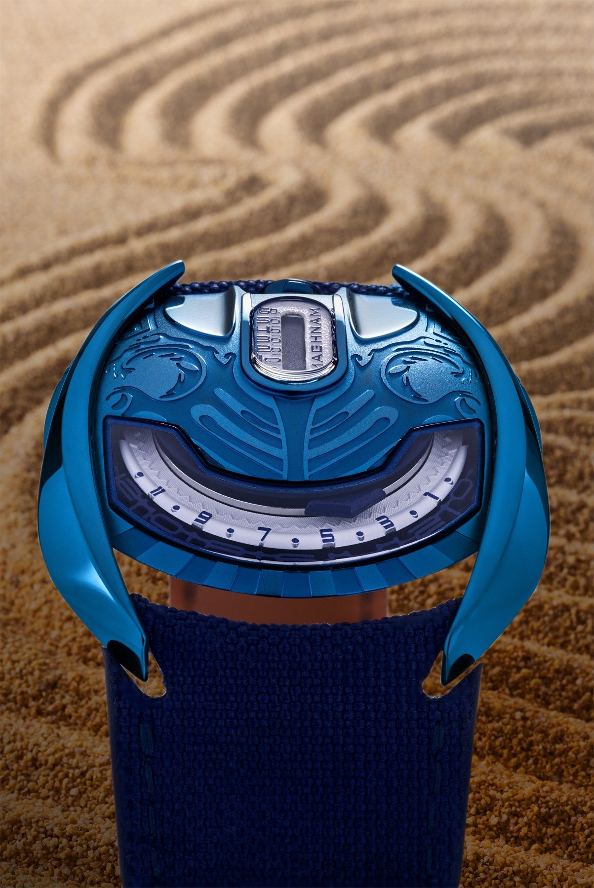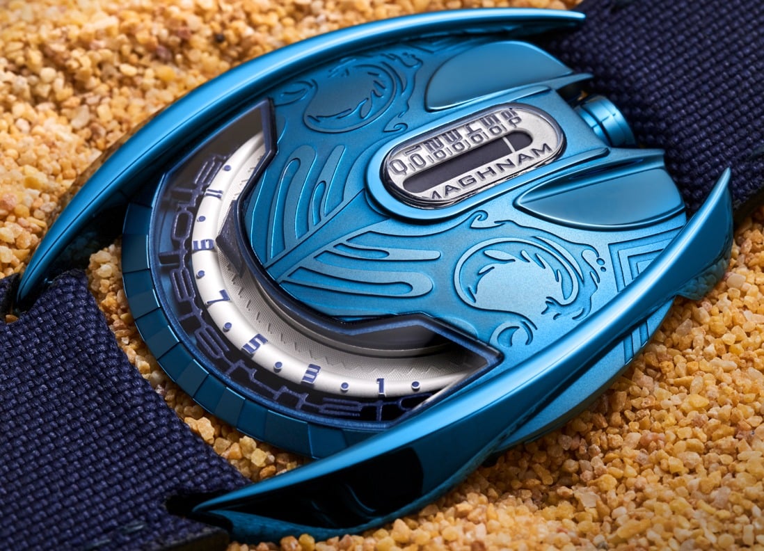 First impressions of the Mohareb are undoubtedly striking. It is an ultra thin shaped watch inspired by historic warrior helmets that transforms time into a kinetic language through the use of a retrograde jump hour and a vertical minute indicator. Each of our collaborative watches features a unique engraved pattern meant to recall ancient warrior culture expressed through runic symbolism and hieroglyphics. We've named the bronze colorway 'Desert Relic' and the blue 'Ocean Relic' to push this concept just that bit further — as if these watches were future relics buried deep in the desert sand, or at the bottom of the ocean floor, left behind for distant explorers.