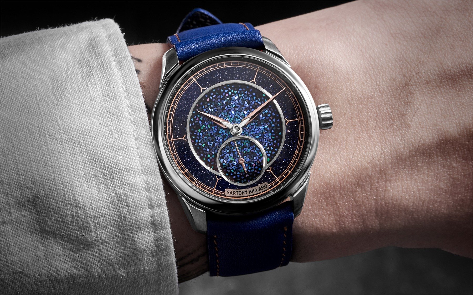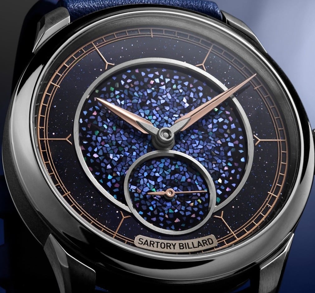 The full titanium build of Uchü translates into an ultra-lightweight wearing experience that parallels its cosmic theme. Offering a fully polished concave bezel, the watch continues with satin brushed lugs and case middle, converging into polished bevels. Likewise, the crown is satin brushed with polished accents highlighting the Sartory Billard emblem.