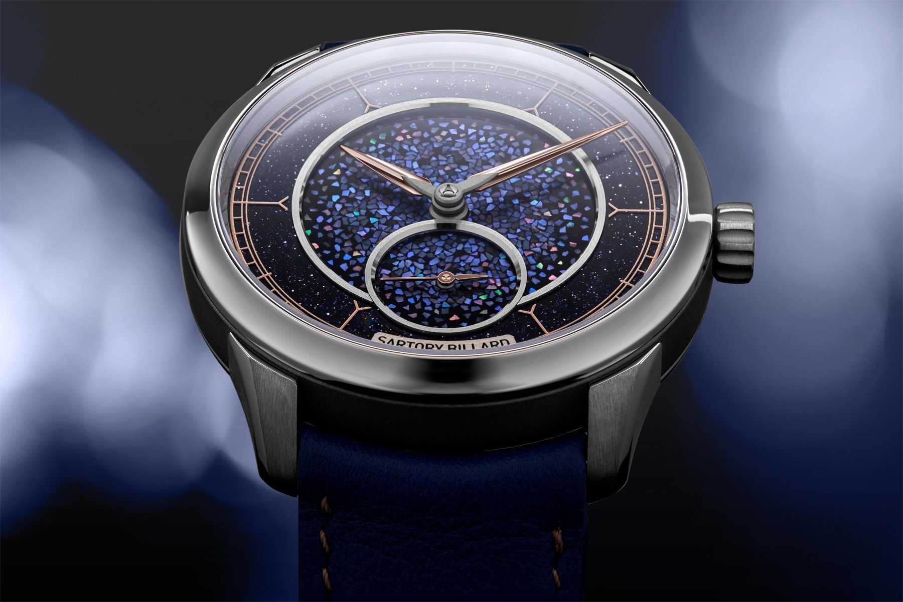 The incredible dial truly rewards repeated observation. The multipart dial construction is slightly recessed against the aventurine chapter ring, with both components further distinguished with the help of brushed metal rings. For the sake of legibility as much as aesthetics, the overarching blue color palette is complemented with rose gold-coated hour and minute hands constructed in two parts, with a striking juxtaposition between the frosted steel base and high polish gold.
